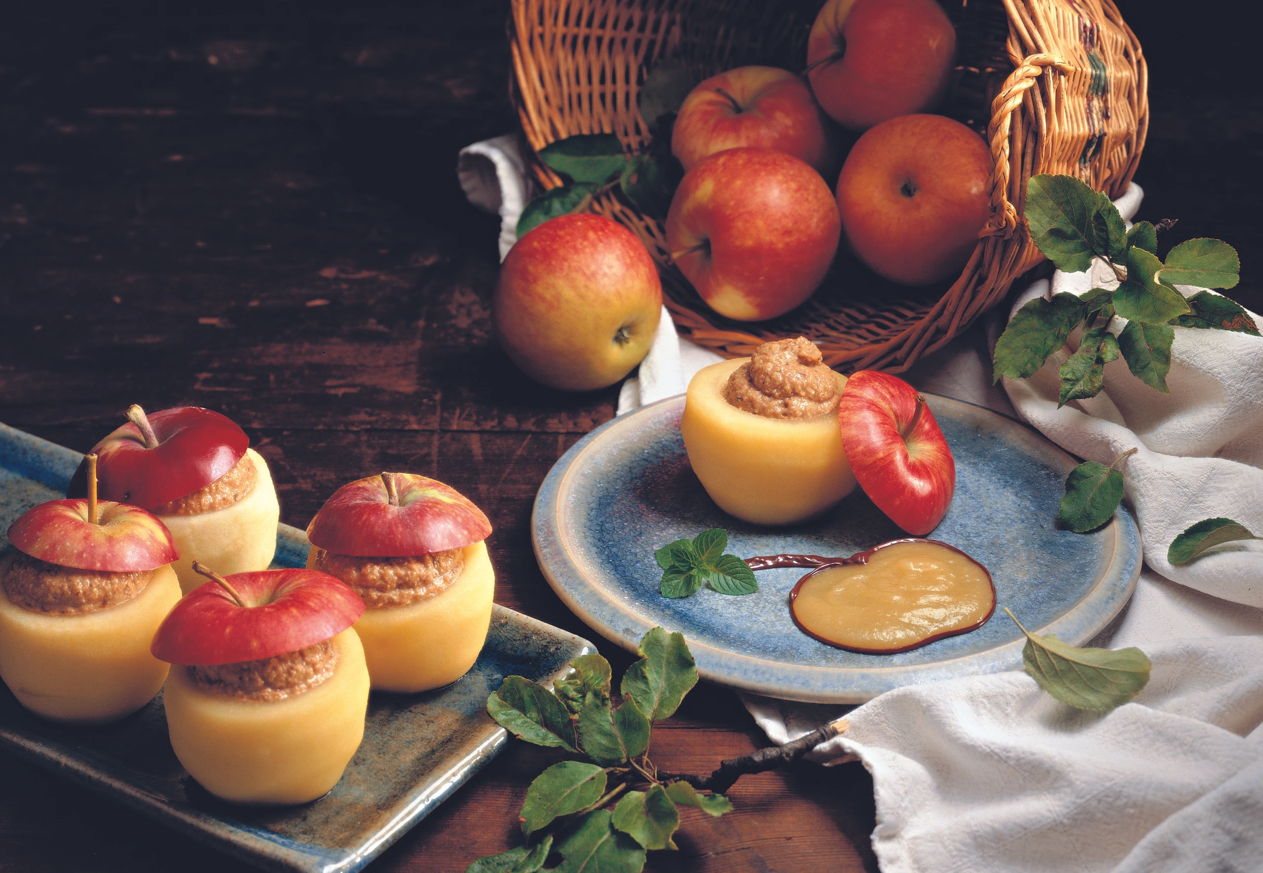 Äpfel mit einem Siebschöpfer aus dem Fond heben, auf einem Küchentuch abtropfen lassen, mit der Nußmasse füllen, mit den Dekkeln belegen und anrichten.