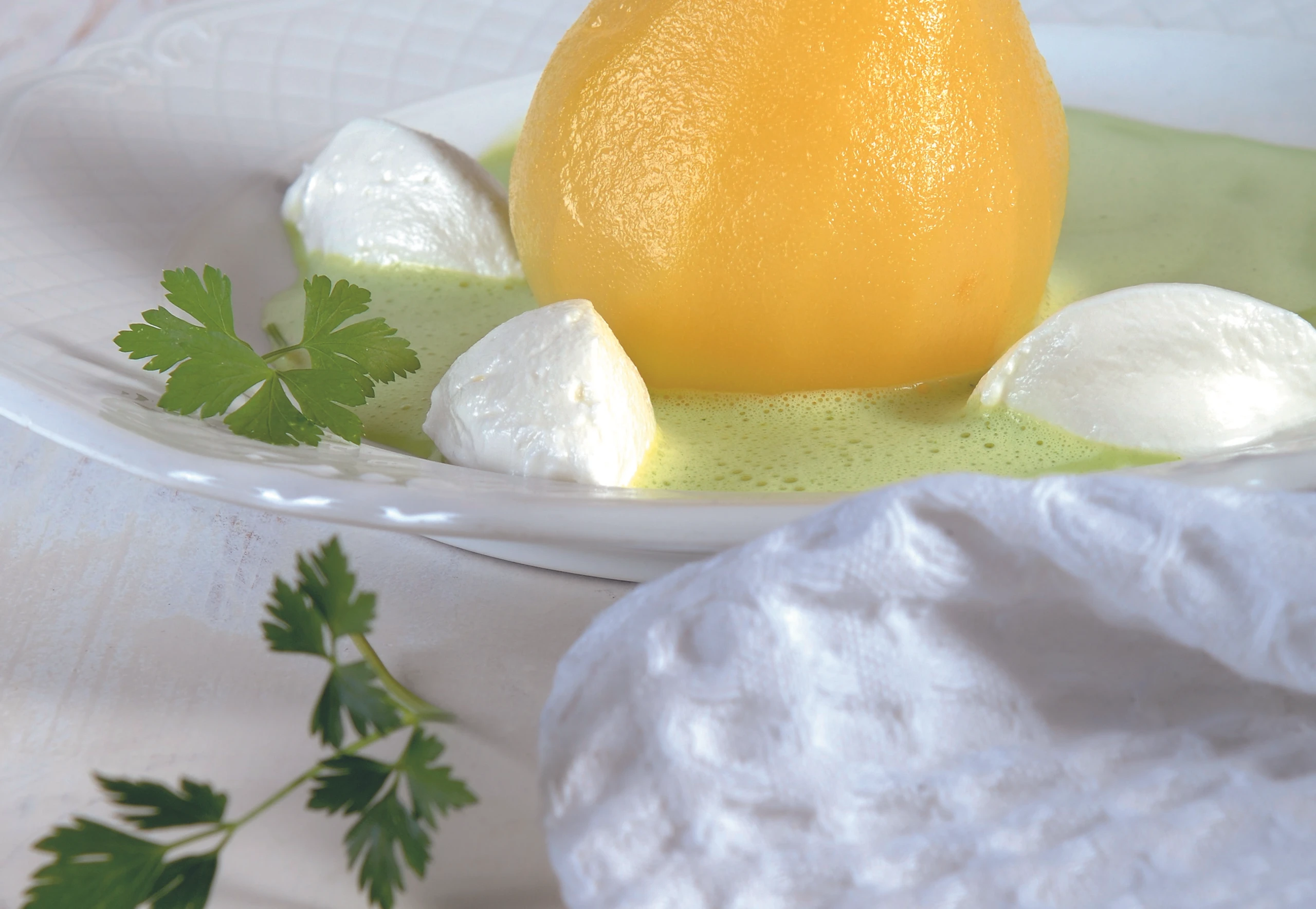Petersilblättchen abzupfen und entsaften. Butter aufschäumen, Mehl darin unter Rühren anschwitzen. Suppe zugießen, Sauce unter Rühren kurz köcheln. Petersilsaft einrühren, Sauce salzen und pfeffern.