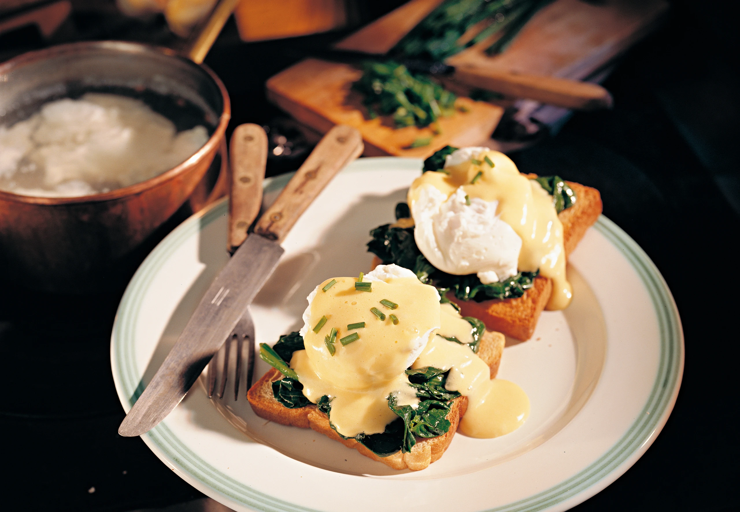 Pochierte Eier auf Blattspinat mit Sauce hollandaise