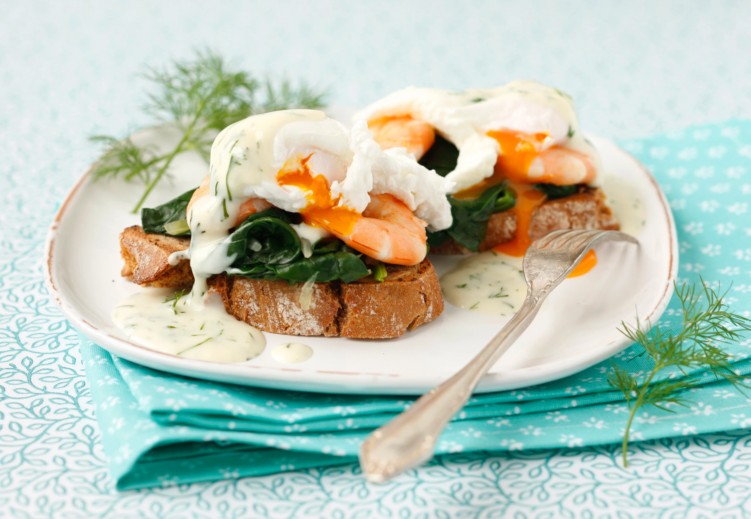 - Parallel dazu Wasser mit Salz und 1 Schuss Essig aufkochen. Hitze reduzieren, Eier einzeln ins Wasser gleiten lassen. Mit einem Löffel das stockende Eiklar über den Dotter schlagen. Eier ca. 3 Minuten ziehen lassen, herausheben und abtropfen lassen. Brote toasten, Spinat, Garnelen und Eier darauf anrichten und mit der Sauce servieren. Eventuell mit Dille garnieren.