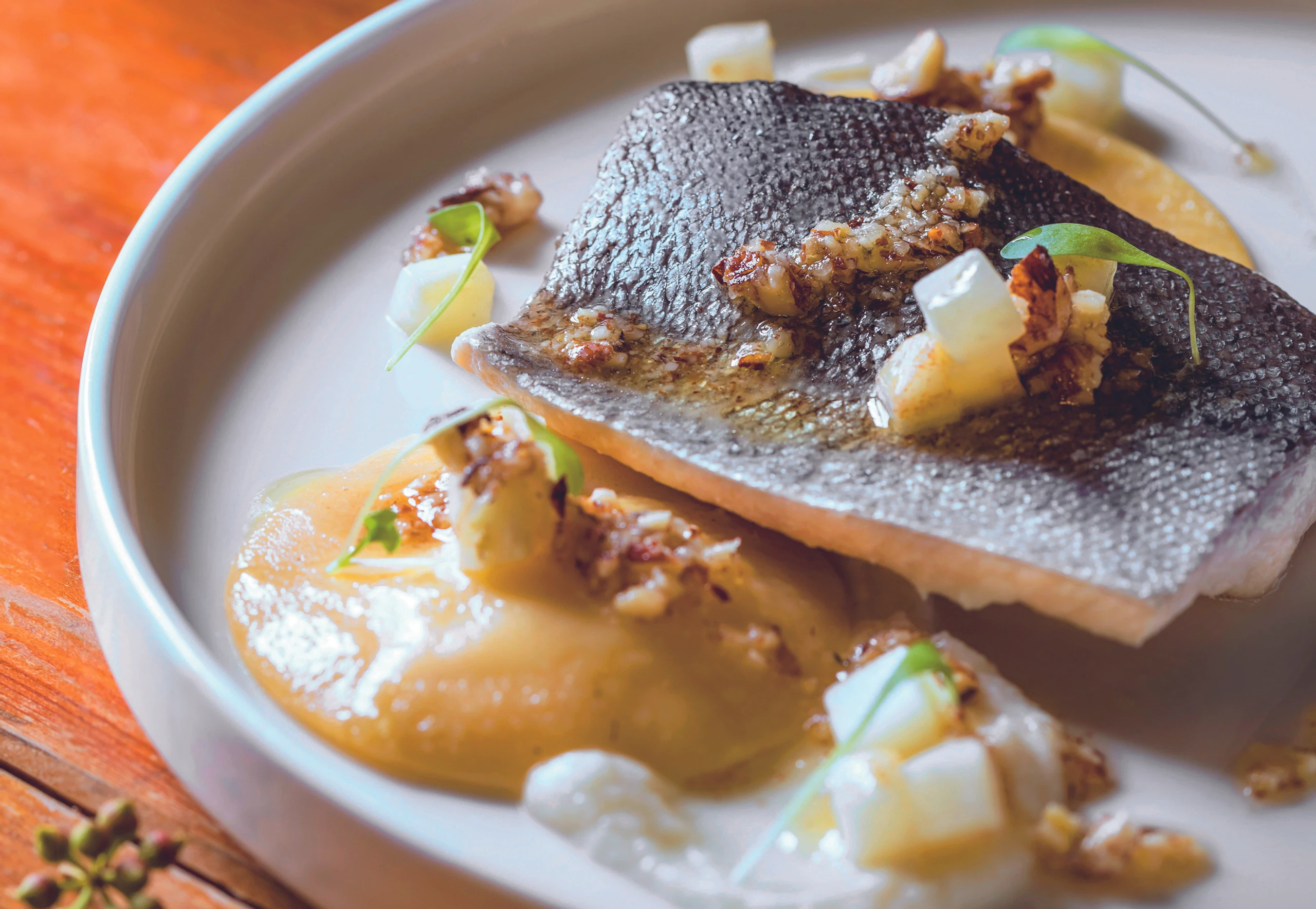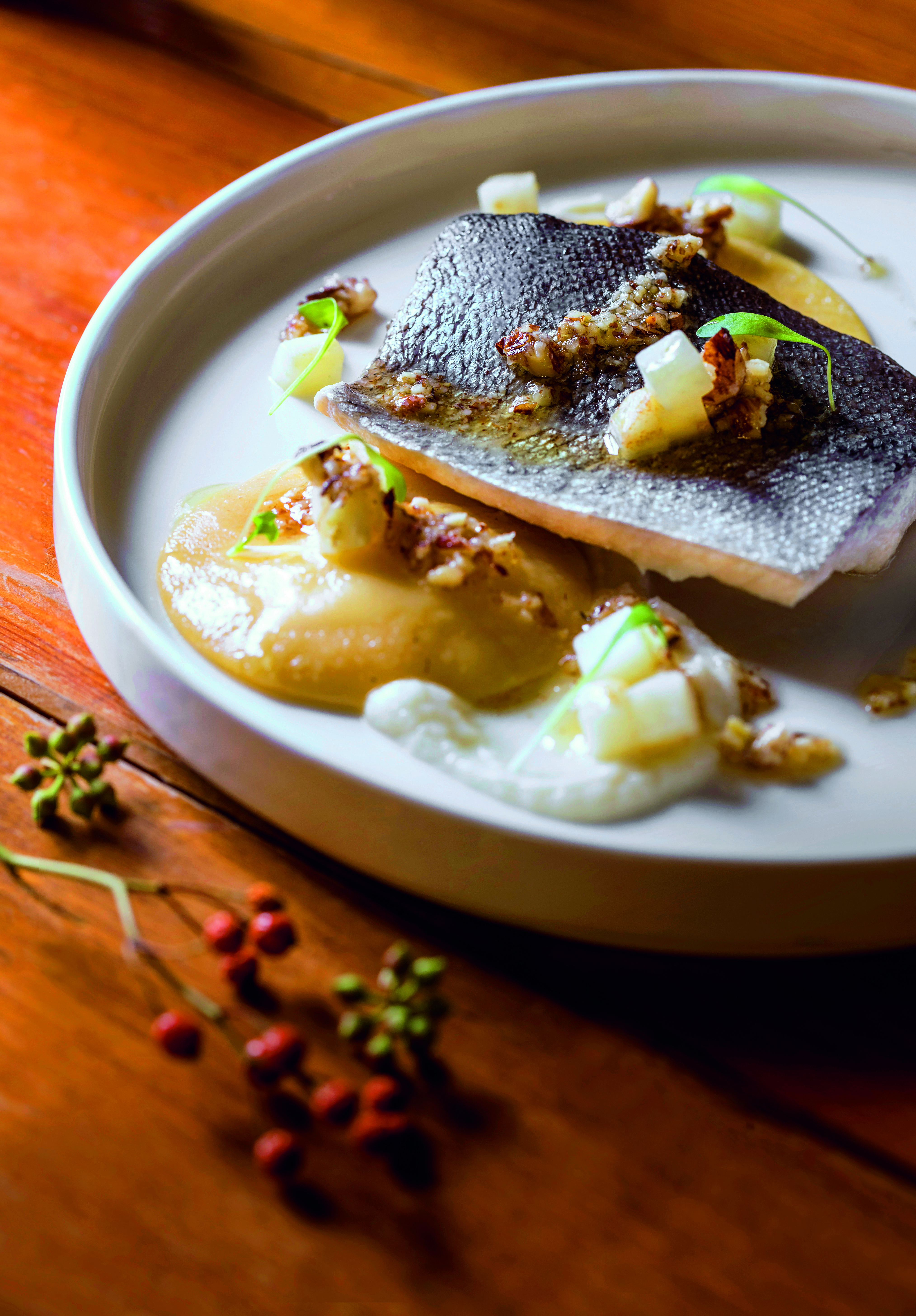 - Pochierfond erhitzen (ca. 60°C). Filets einlegen und ca. 15 Minuten ziehen lassen. Für die Haselnussbutter Butter erhitzen, Nüsse darin knusprig rösten. Nussöl untermischen.