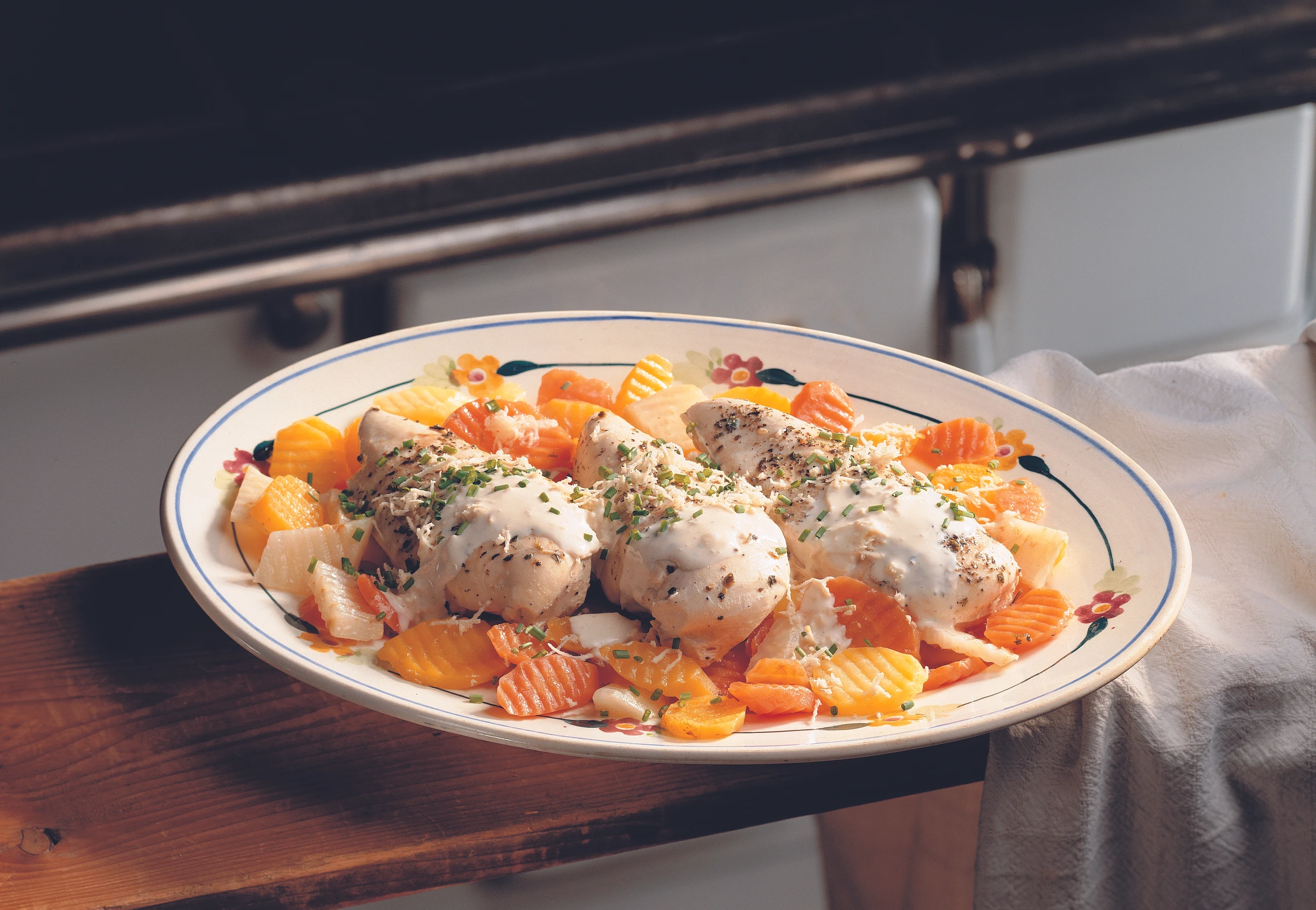 Pochierte Hühnerbrust auf Wurzelgemüse mit Krensauce