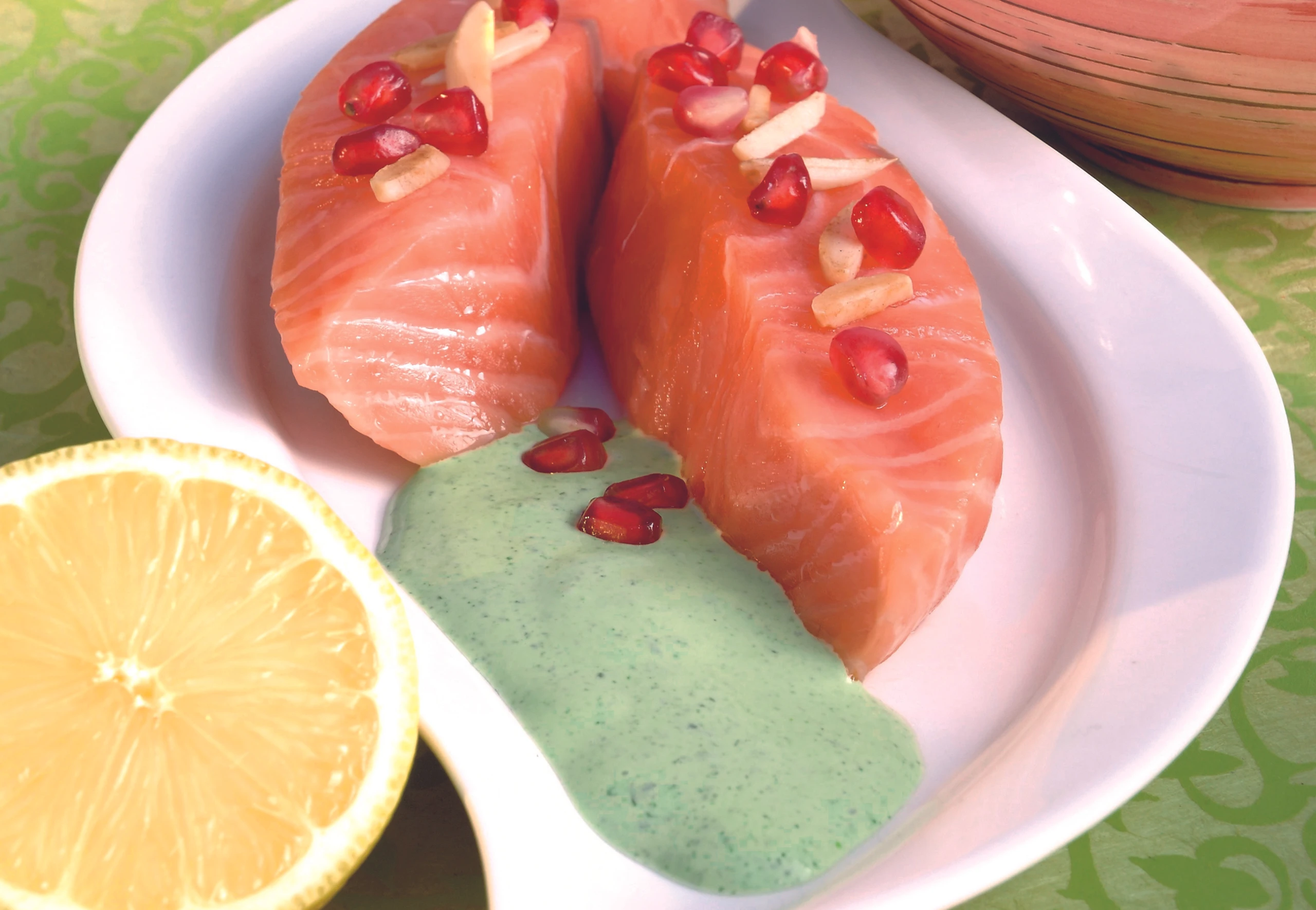 Pochierter Lachs mit Mandel Granatapfel Sauce
