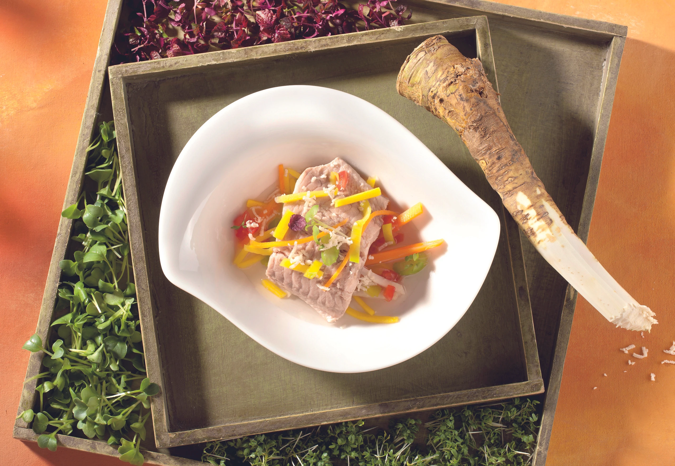 Filets mit Fond und Gemüse in Suppentellern anrichten. Mit Kren und Kresse garnieren. Dazu passen Erdäpfel.