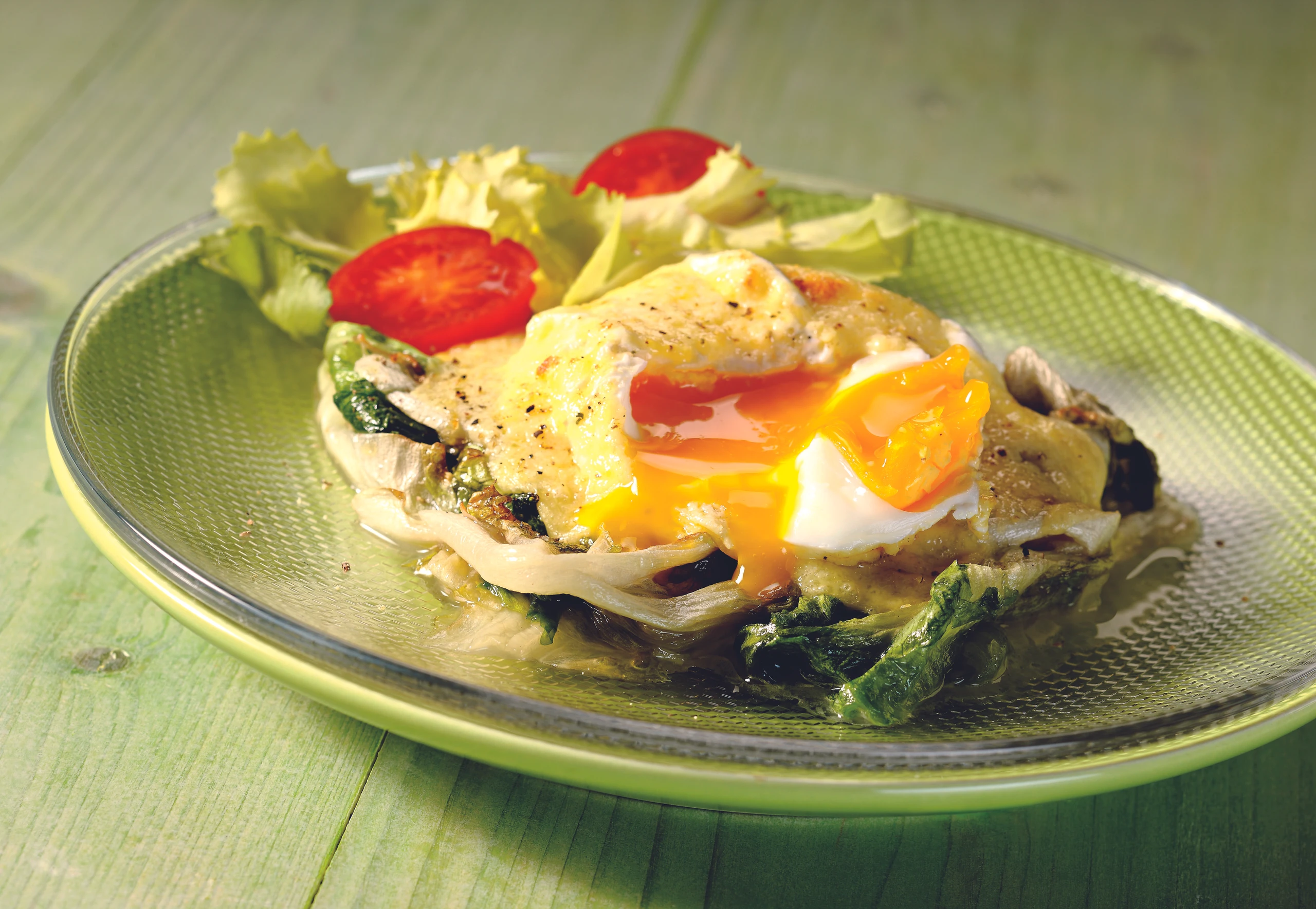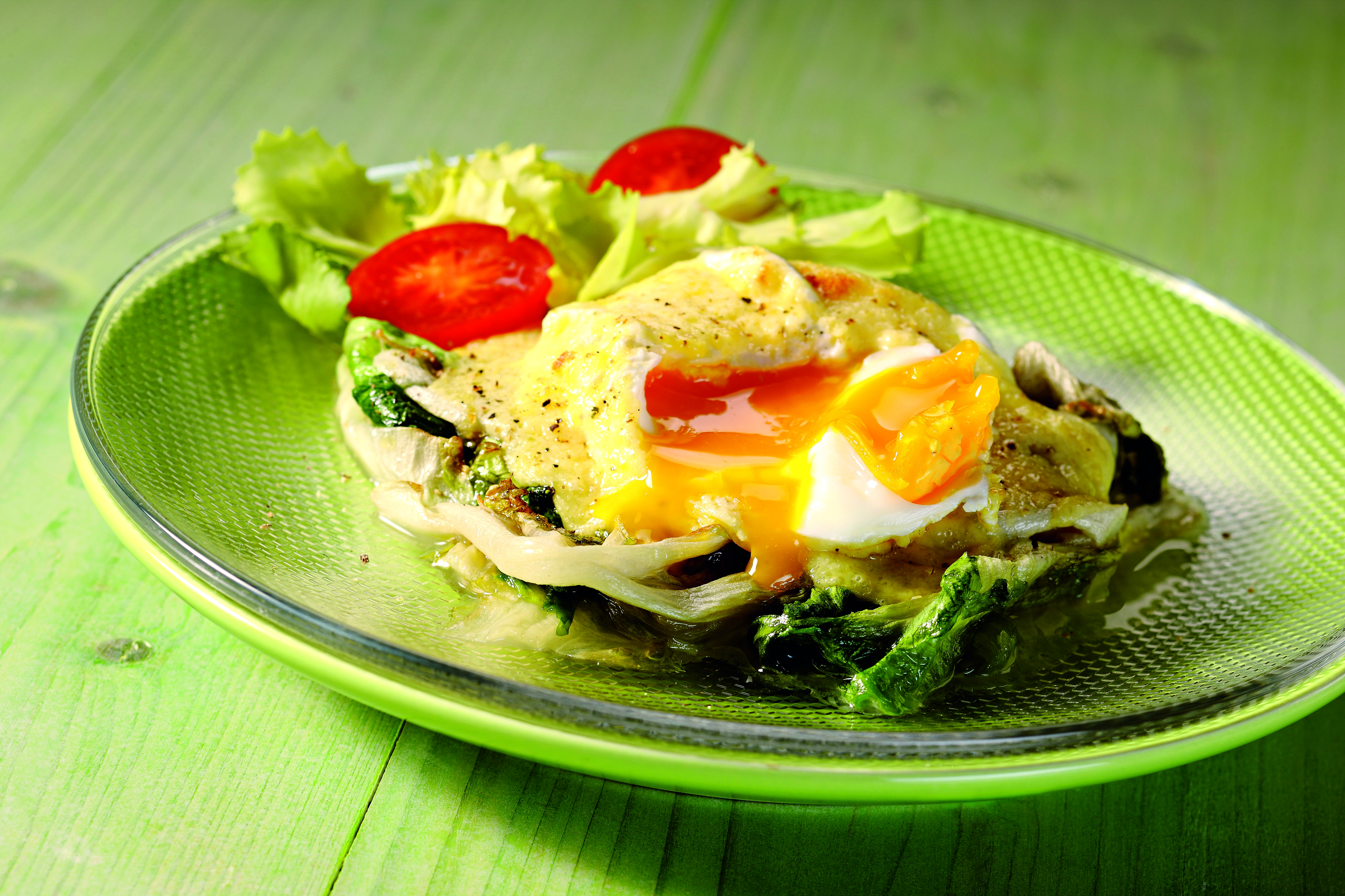 Mit Käsesauce überbackene pochierte Eier auf Endiviengarnitur