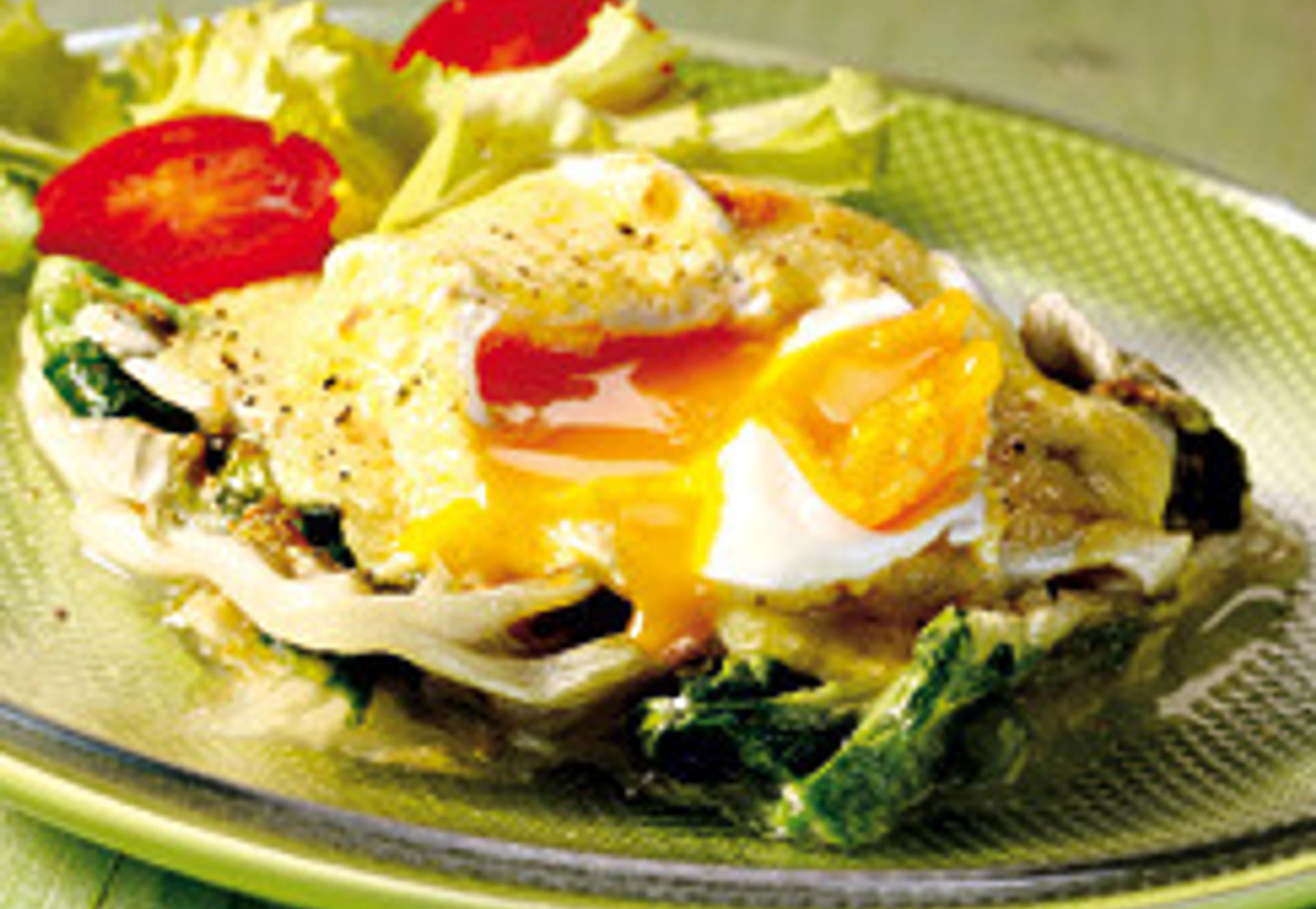 Pochiertes Ei mit Käse Sauce überbacken und Endivien Garnitur