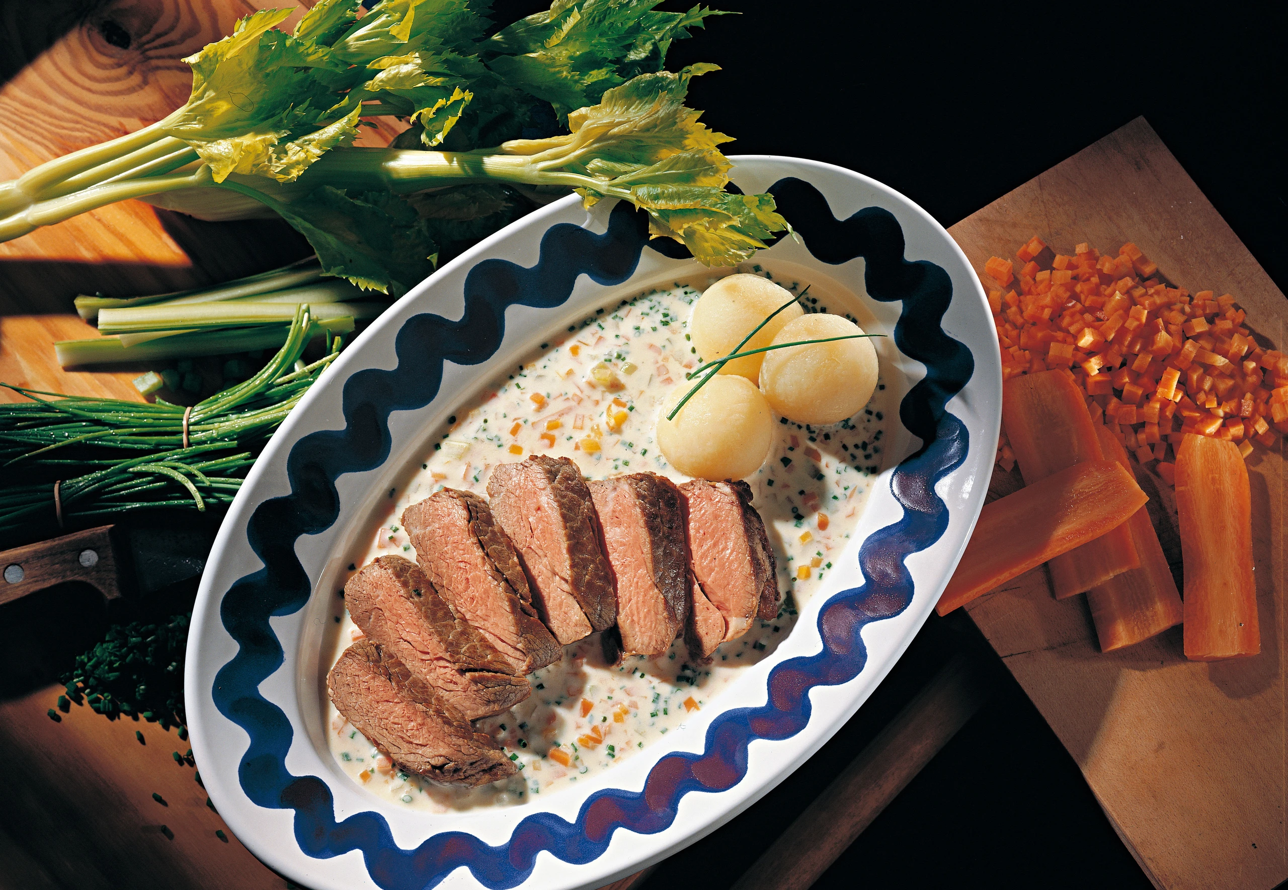 Fleisch quer zur Faser in nicht zu dünne, schräge Scheiben schneiden und mit der Sauce anrichten. Dazu passen besonders gut Salzerdäpfel.