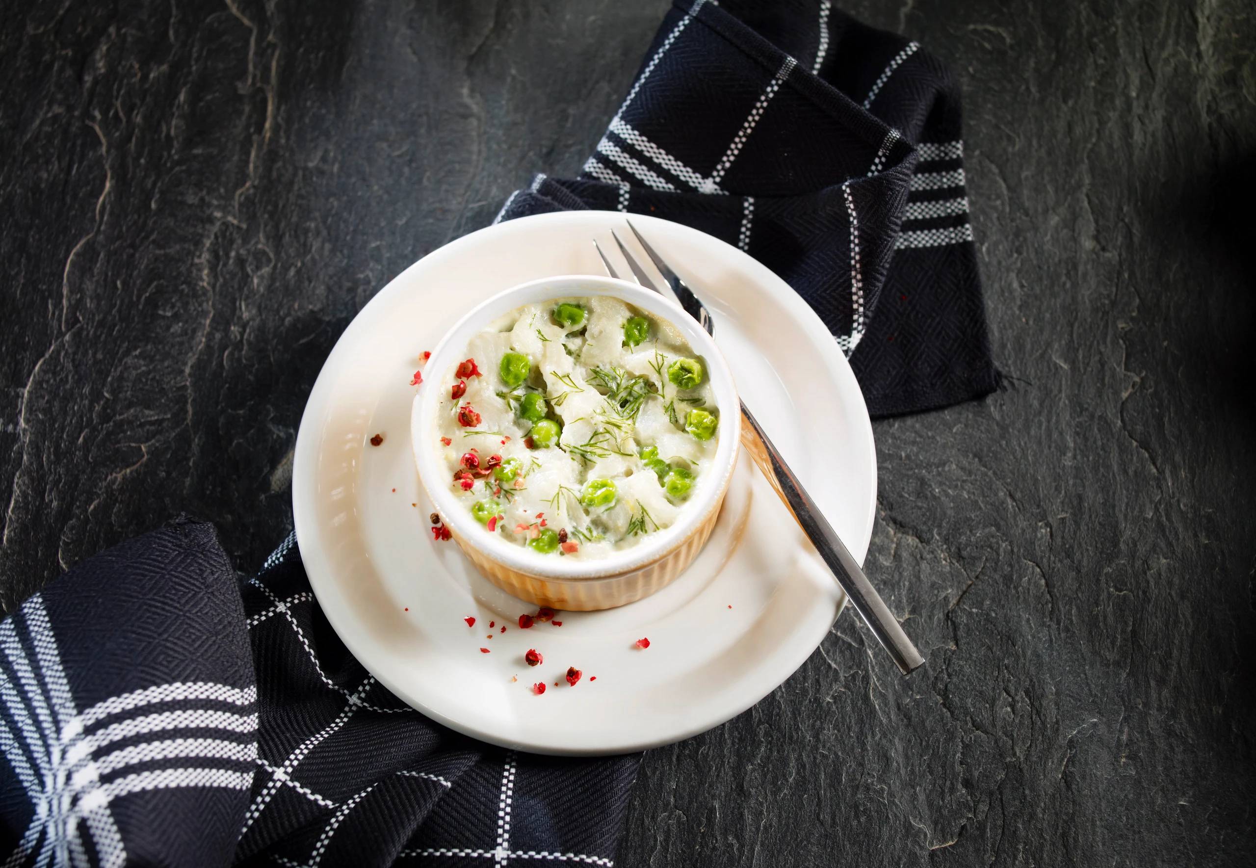 Schollenfilets in kleine Stücke schneiden, mit Erbsen, Eiklar, Crème fraîche und Dille gut verrühren. Tatar mit Salz, Pfeffer, Zitronensaft und -schale würzen.
