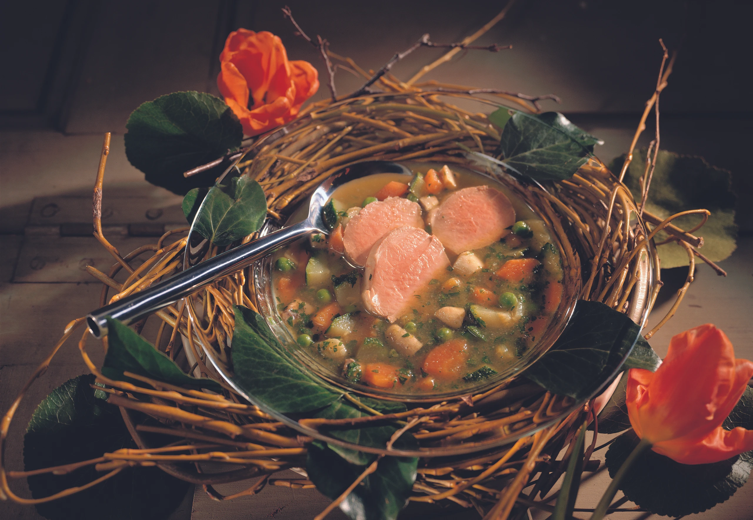 Das reservierte Gemüse wieder in den Fond geben, mit Salz, Pfeffer und Majoran würzen und erwärmen. Filet in Scheiben schneiden und mit dem Gemüsefond anrichten. Als Beilage passen gekochte Erdäpfel.