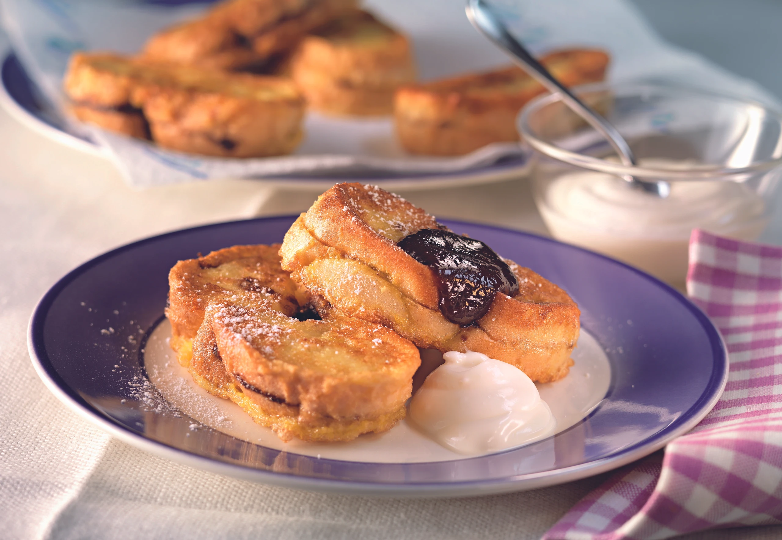 - Semmeln in 24 längliche ca. 1 cm dicke Scheiben schneiden; die Anschnitte weggeben. Die Hälfte der Scheiben dick mit Powidl bestreichen und mit den übrigen Scheiben zusammensetzen.