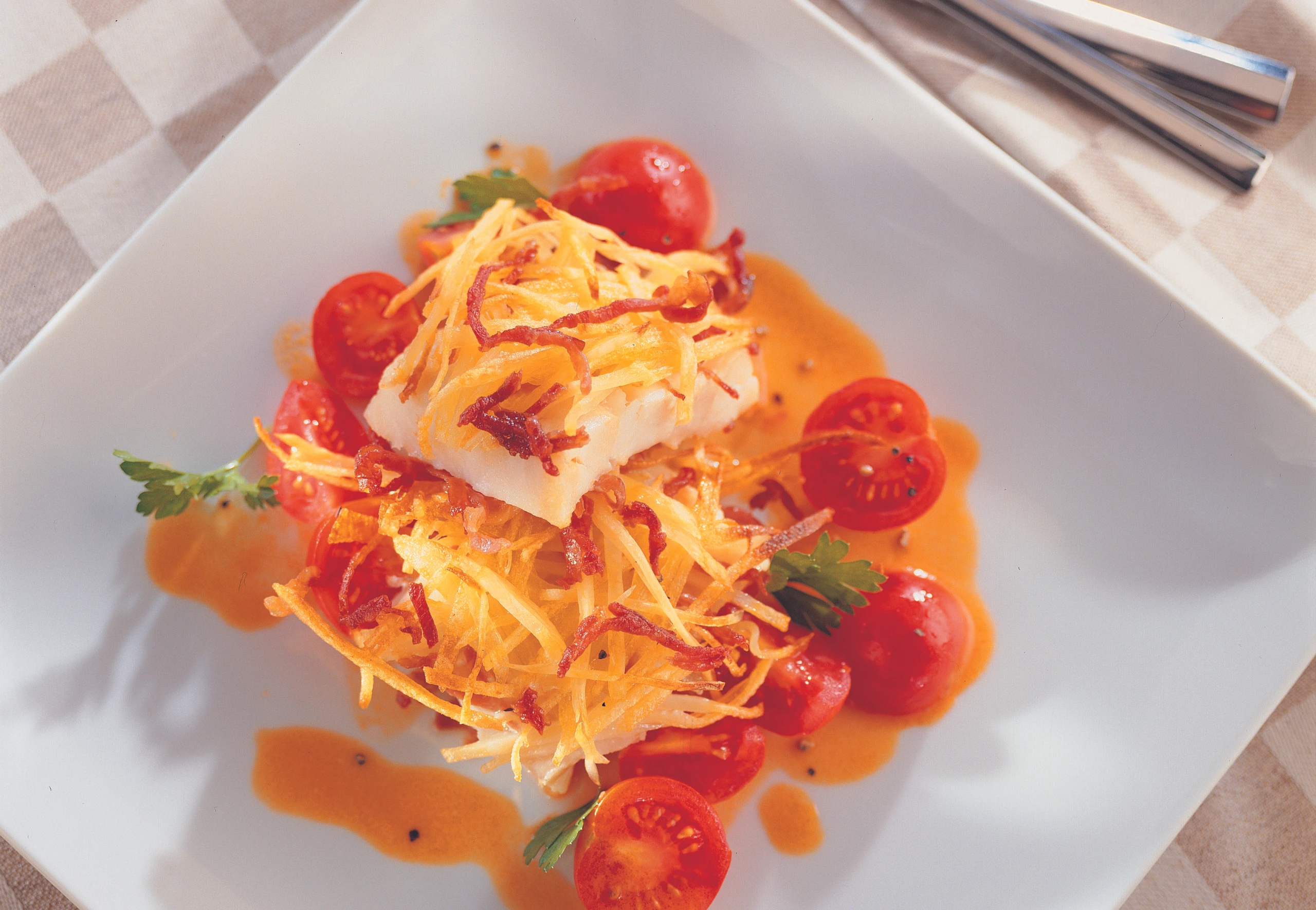Polar-Dorsch salzen, pfeffern, mit der Masse umhüllen. Öl erhitzen, Polar-Dorsch darin auf einer Seite scharf anbraten. Polar-Dorsch ins Rohr schieben (untere Schiene / Gitterrost) und ca. 8 Minuten knusprig fertig braten, nach halber Garzeit wenden.