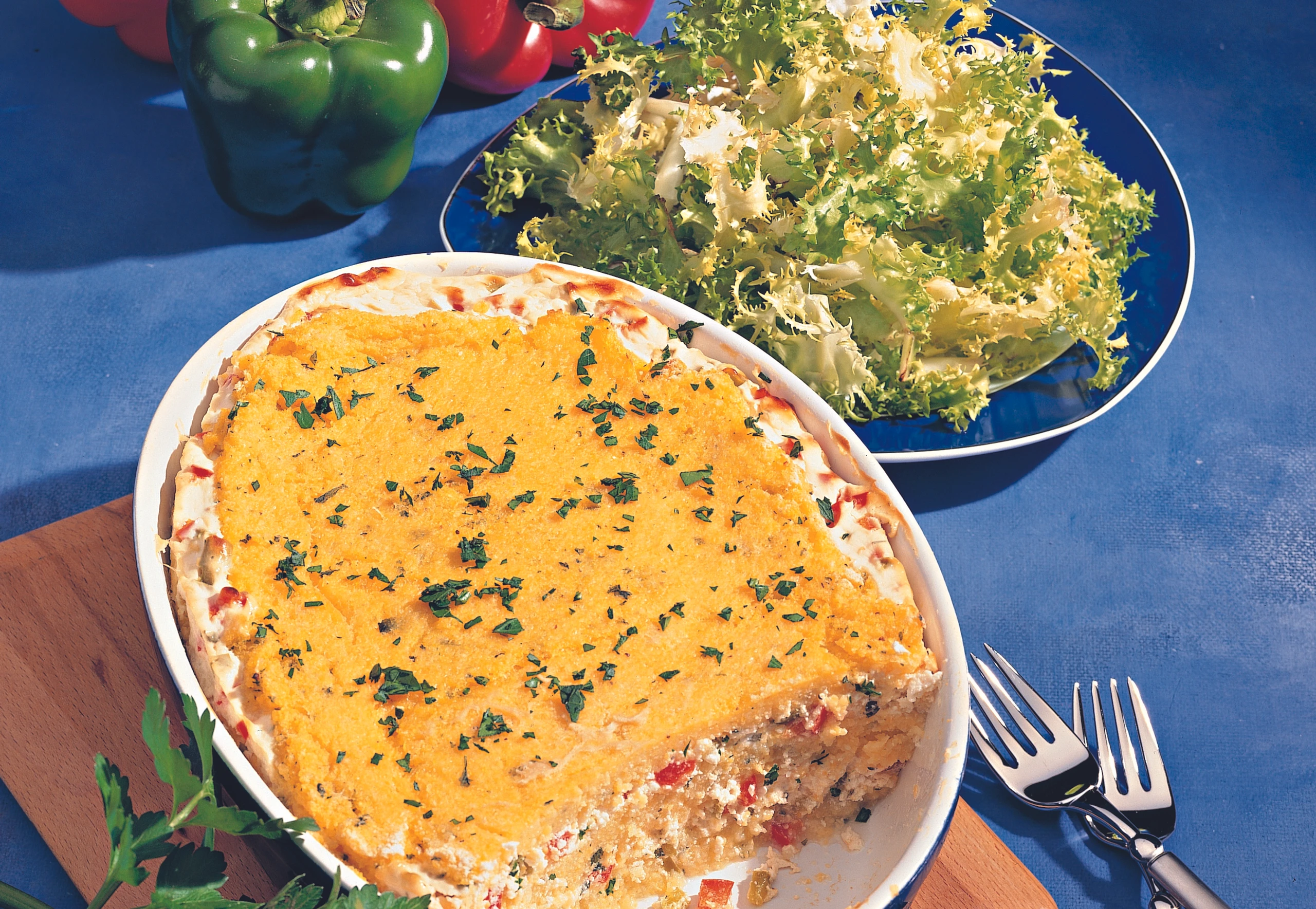 Backrohr auf Grillstellung schalten und Auflauf goldgelb überkrusten. Auflauf vor dem Servieren eventuell mit gehackter Petersilie bestreuen. Als Beilage paßt Salat.