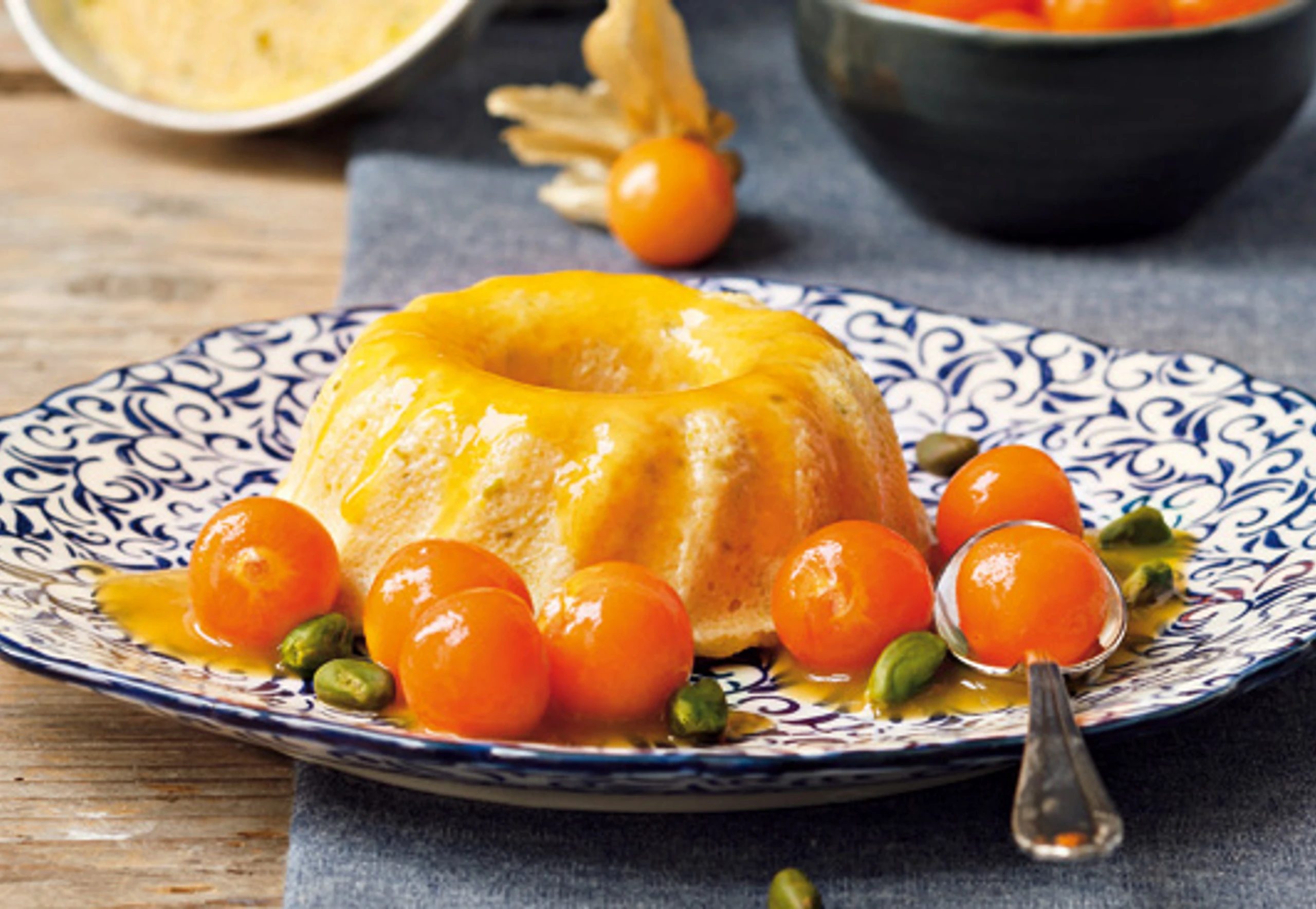 - Für das Kompott Physalis von der Hülle befreien. Orangensaft und Zucker verrühren, dickflüssig einkochen und vom Herd nehmen. Physalis und Pistazien zugeben und ziehen lassen. Förmchen kurz in heißes Wasser tauchen, Flammeris auf Teller stürzen und mit dem Kompott servieren.