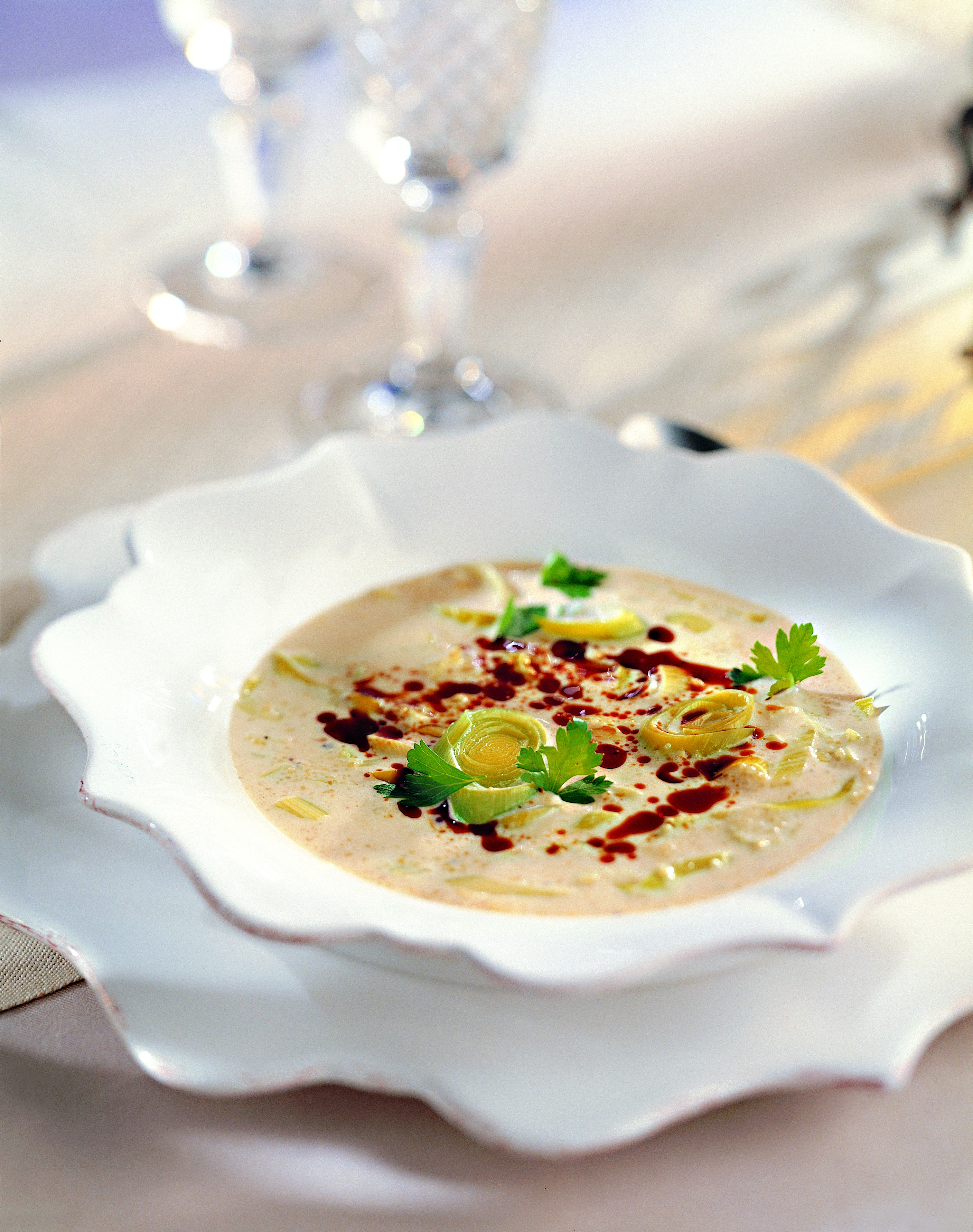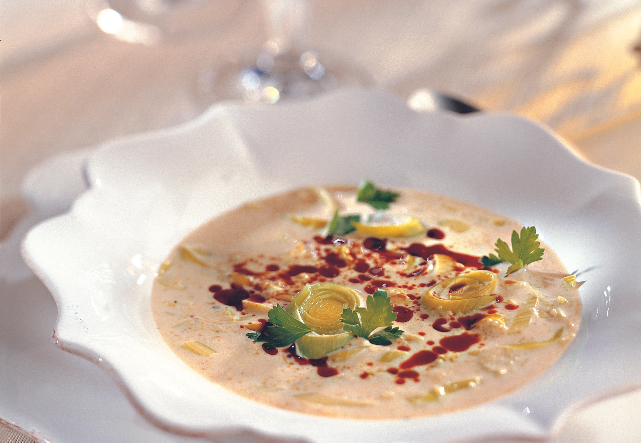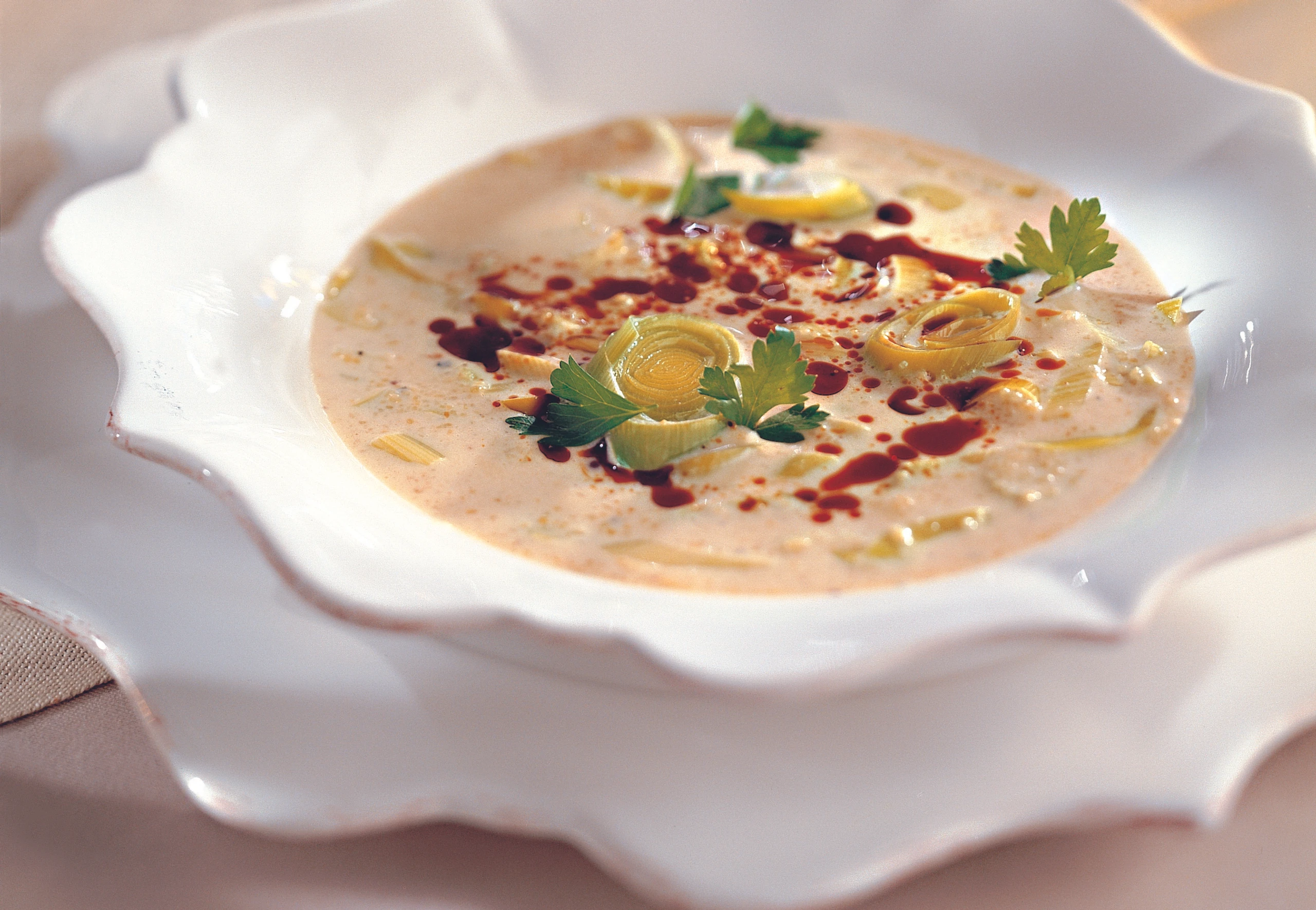 Lauch in Butter hell anschwitzen, Grieß zugeben und unter Rühren anschwitzen. Mit Wein ablöschen und mit Suppe aufgießen. Suppe ca. 10 Minuten köcheln. Nach halber Garzeit Obers einrühren. Suppe mit Salz, Pfeffer und Muskat würzen.
