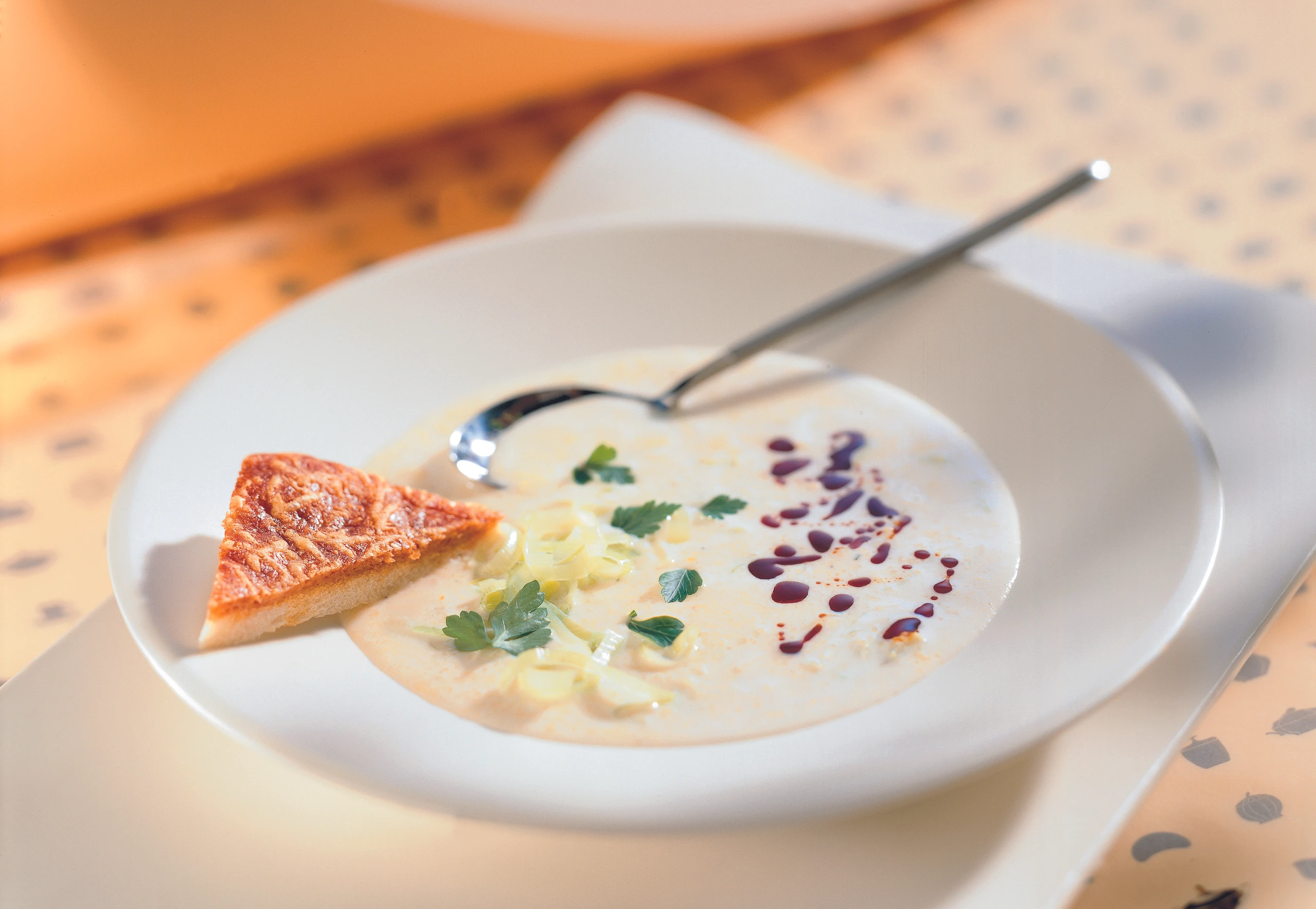 Polenta-Lauchsuppe mit Kernöl und Käsekrusteln