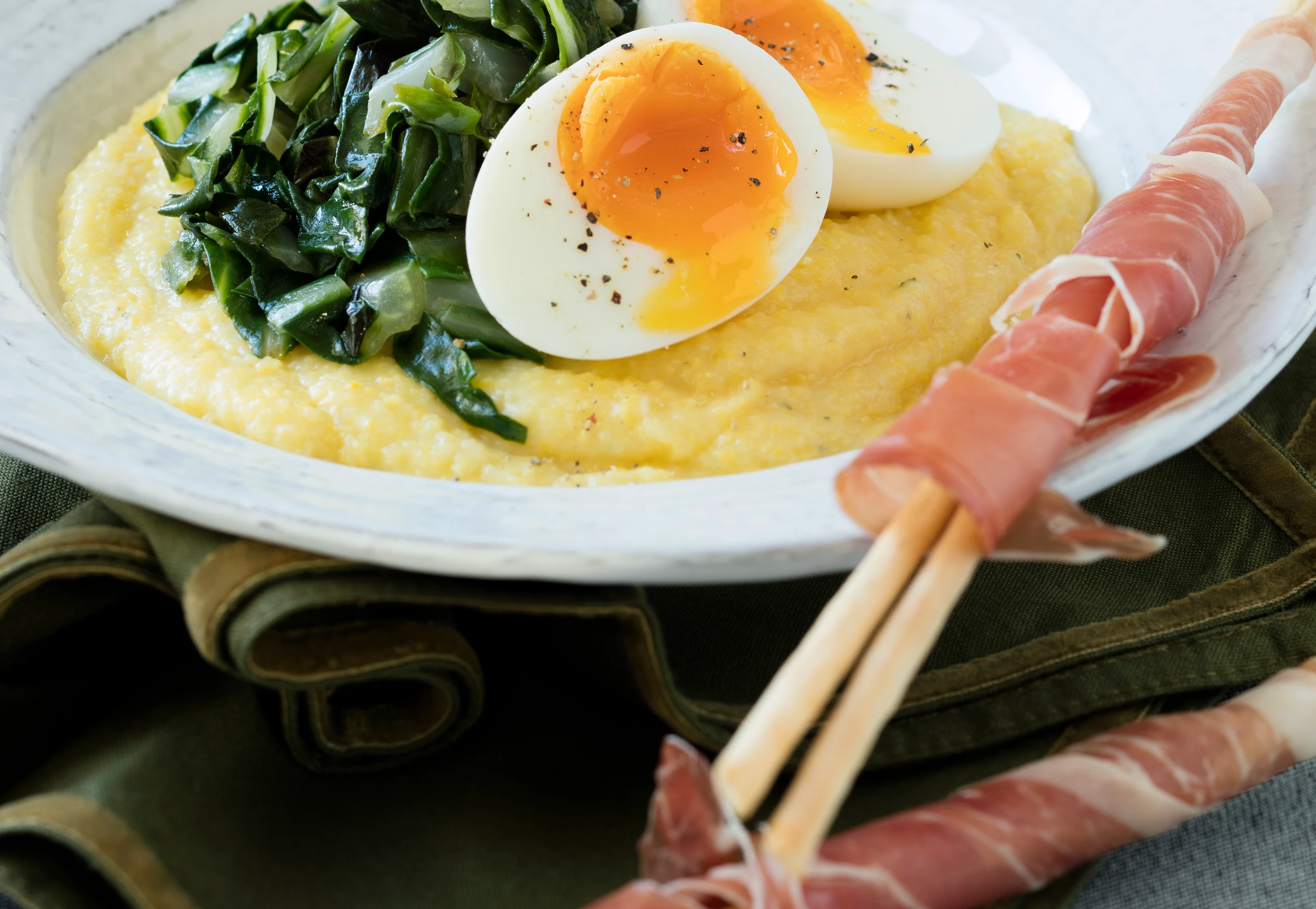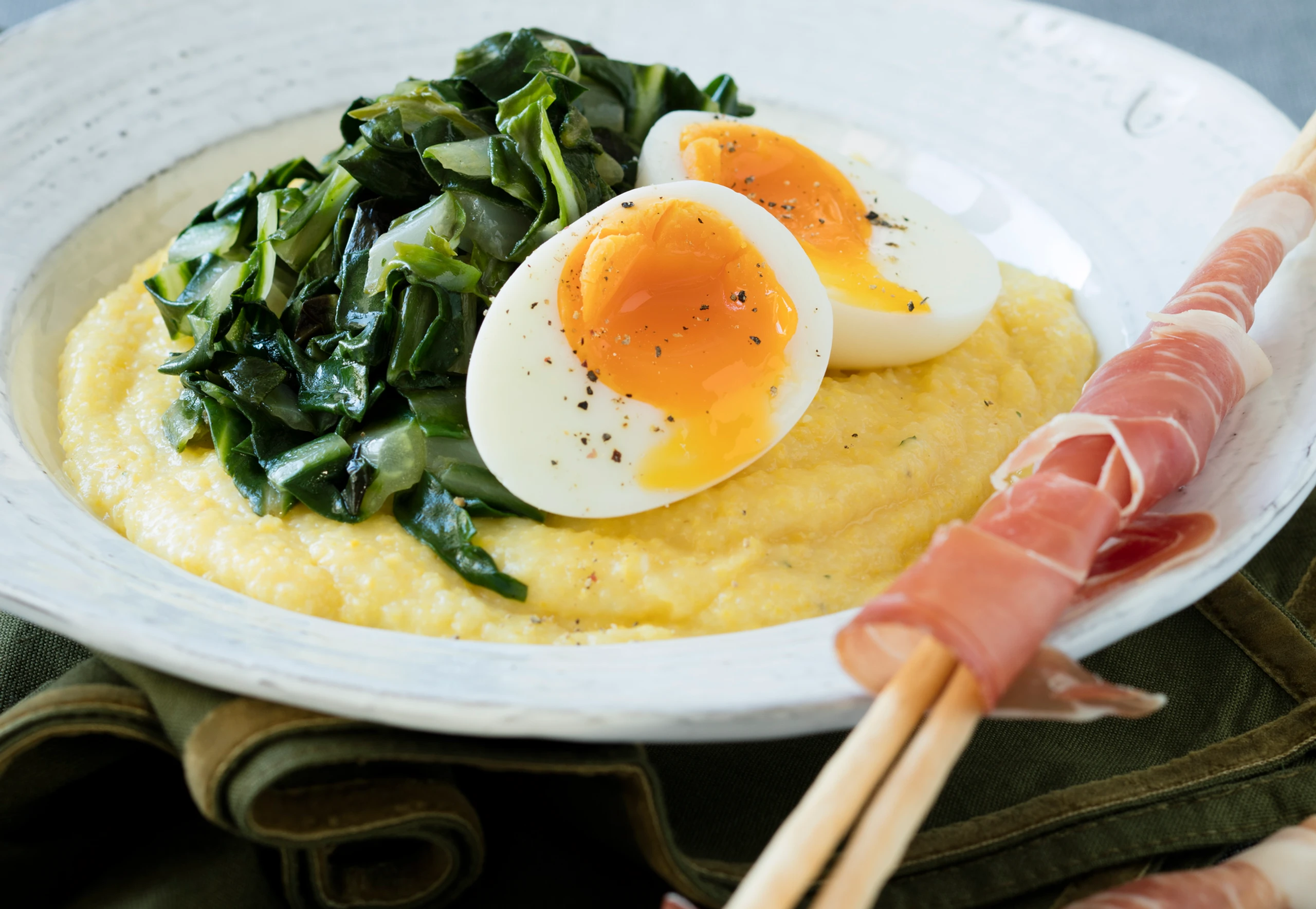 - Eier in Salzwasser ca. 5 Minuten kochen. Grissini paarweise an den Enden mit einer Schinkenscheibe umwickeln. Eier abschrecken, schälen, längs halbieren und pfeffern. Polenta kurz erwärmen und mit Käse verfeinern. Polenta mit Mangold und Eiern anrichten und mit Grissini servieren.