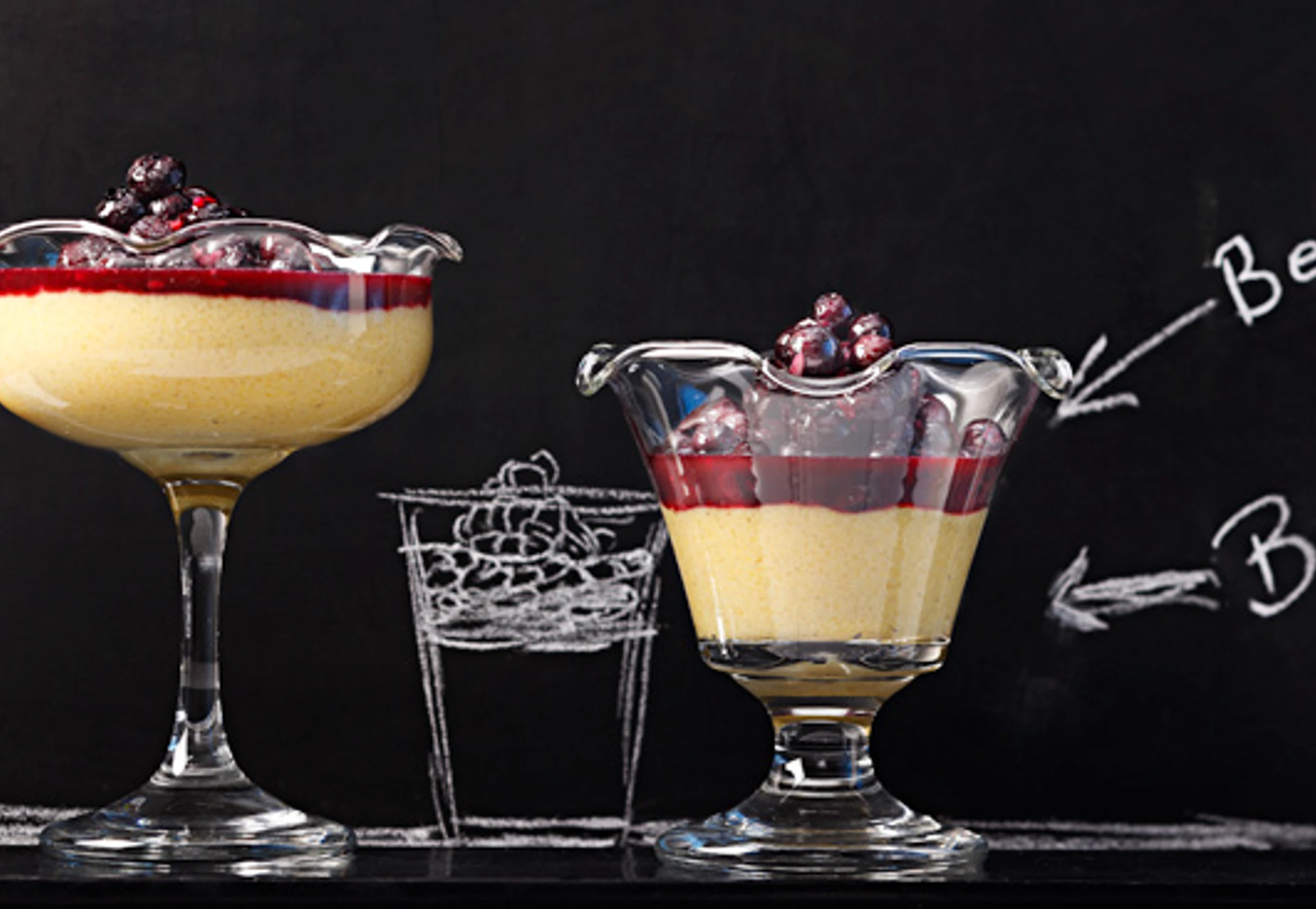 Für die Polenta Milch, Zucker, Zitronenschale und Zimt aufkochen. Polenta einrühren und ca. 20 Minuten köcheln. Masse in 4 Gläser (Inhalt 250 ml) füllen.