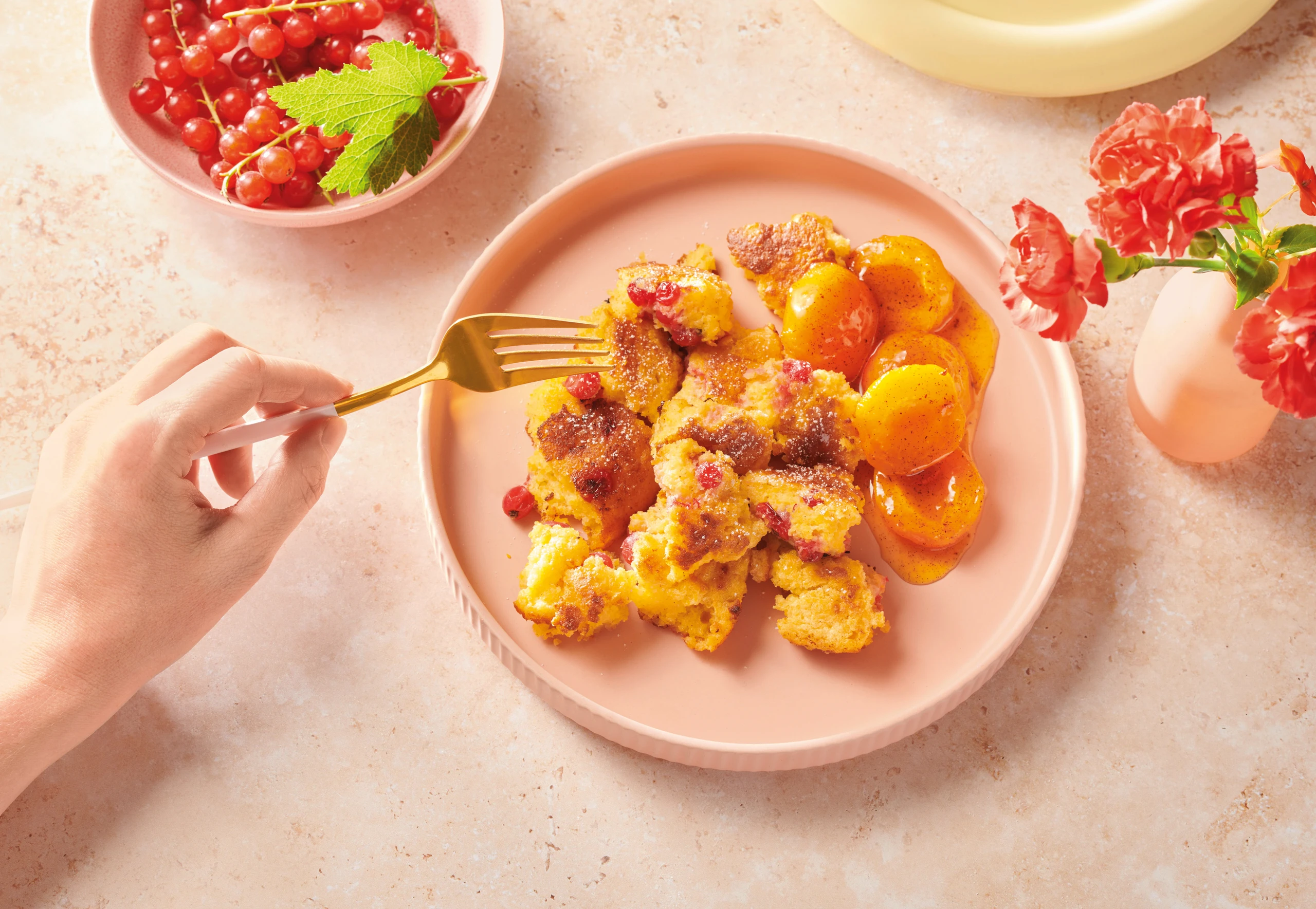 Polenta-Ribisel-Schmarrn mit Marillenkompott