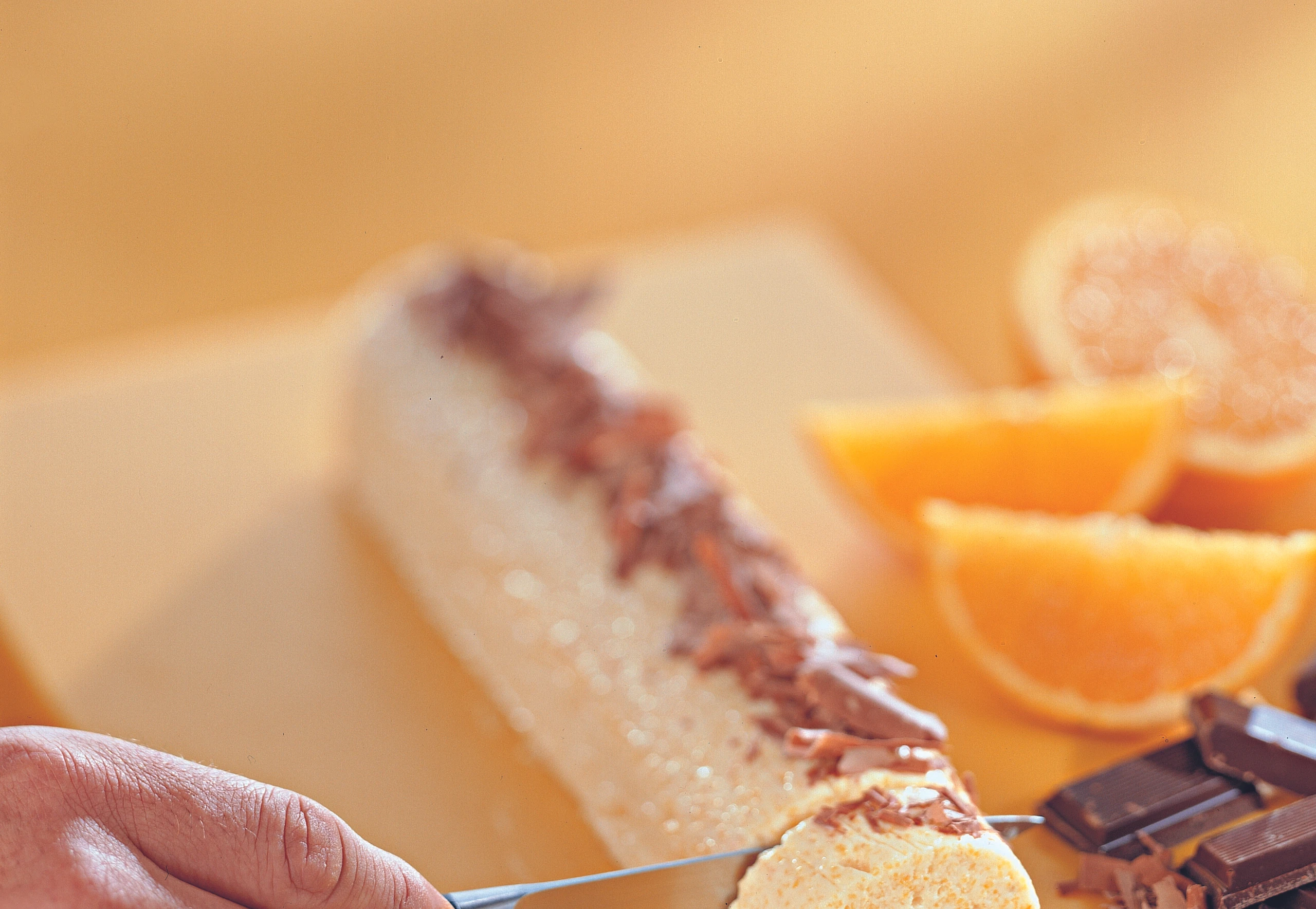 Terrine stürzen, Folie abziehen. Terrine mit den Schokoraspeln garnieren.