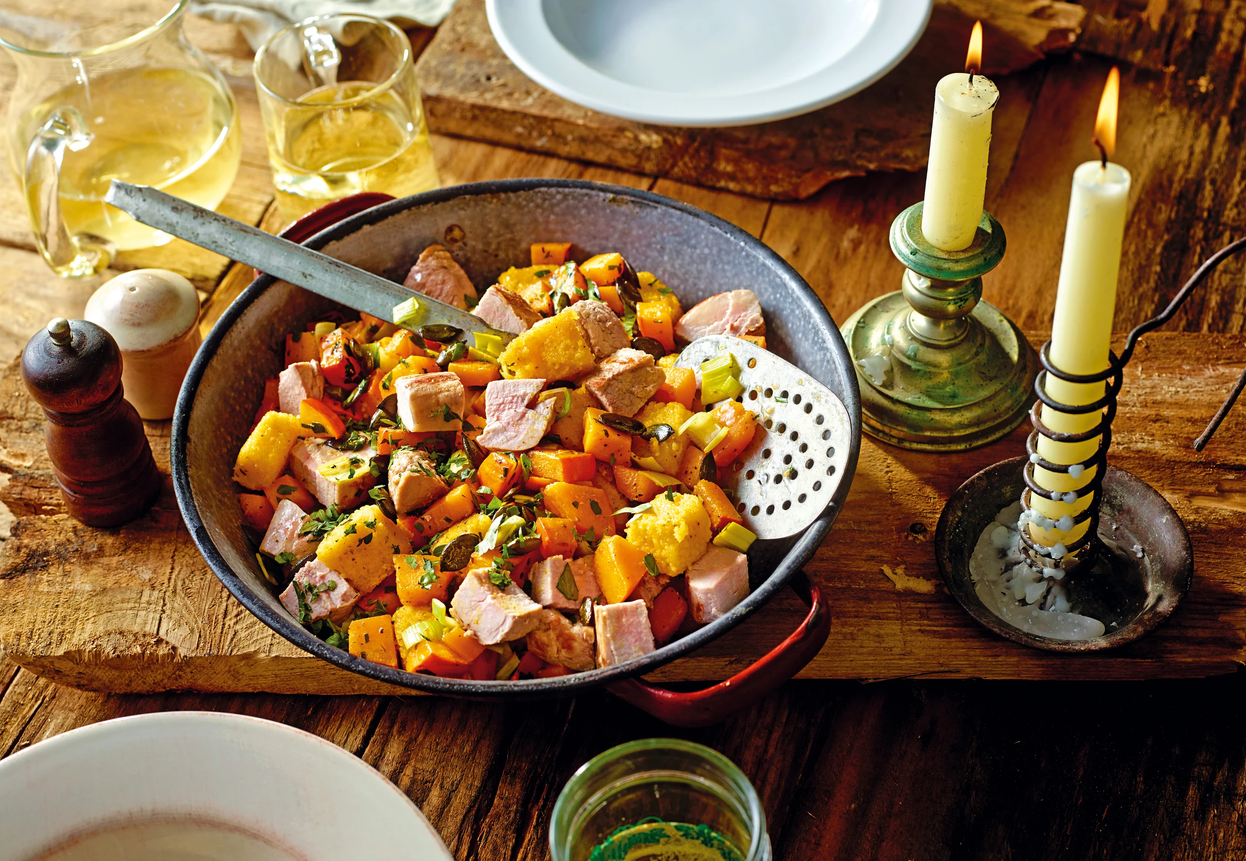 Polentagröstl mit Kürbis, Lauch, Schweinsfilet und Whisky