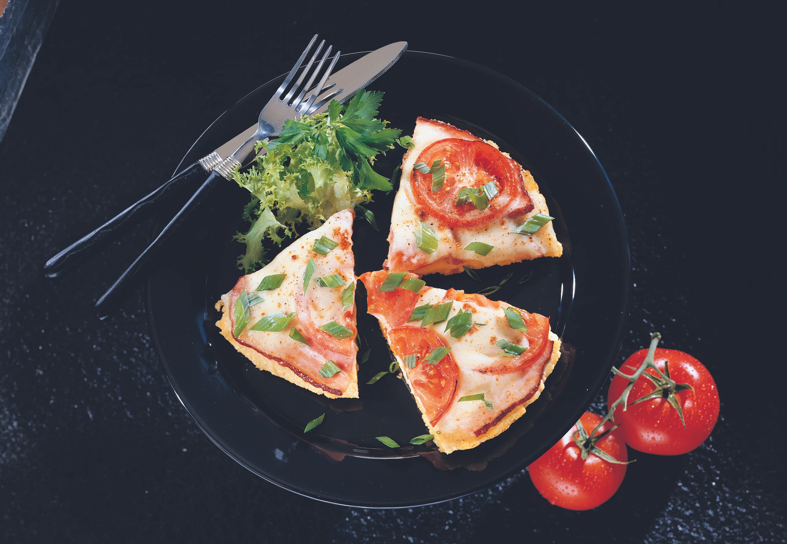Grießmasse mit Speck belegen, darauf die Mozzarella- und Paradeiserscheiben verteilen, mit Salz und Pfeffer würzen und im vorgeheizten Rohr (mittlere Schiene / Gitterrost) ca. 6 Minuten überbacken. Das Jungzwiebelgrün in Streifen schneiden und die fertige Polentapizza damit bestreuen.