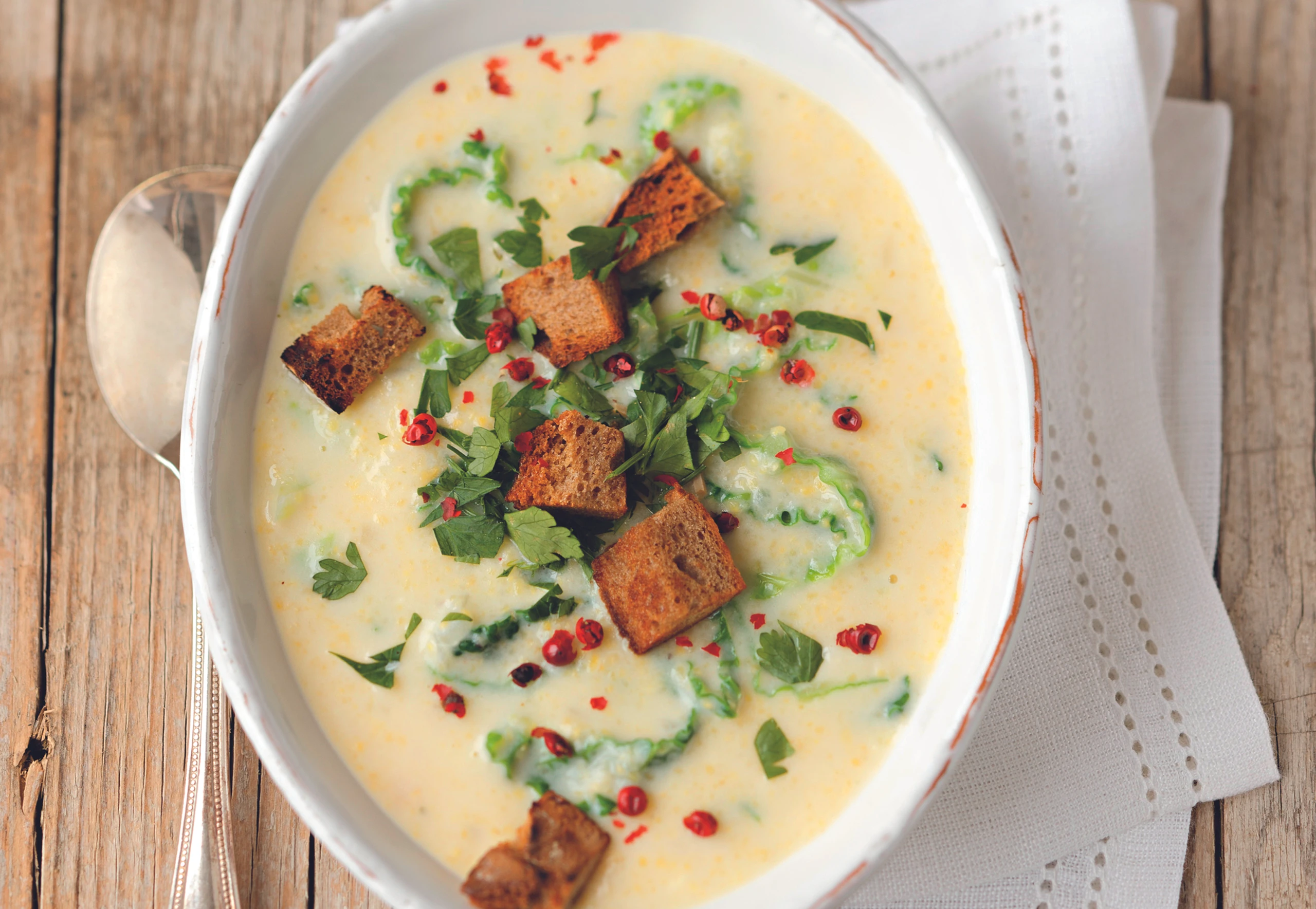 Suppe pürieren, Kohlstreifen unterrühren. Suppe aufkochen, anrichten und mit Petersilie, Brotwürfeln und Rosa Beeren bestreut servieren.