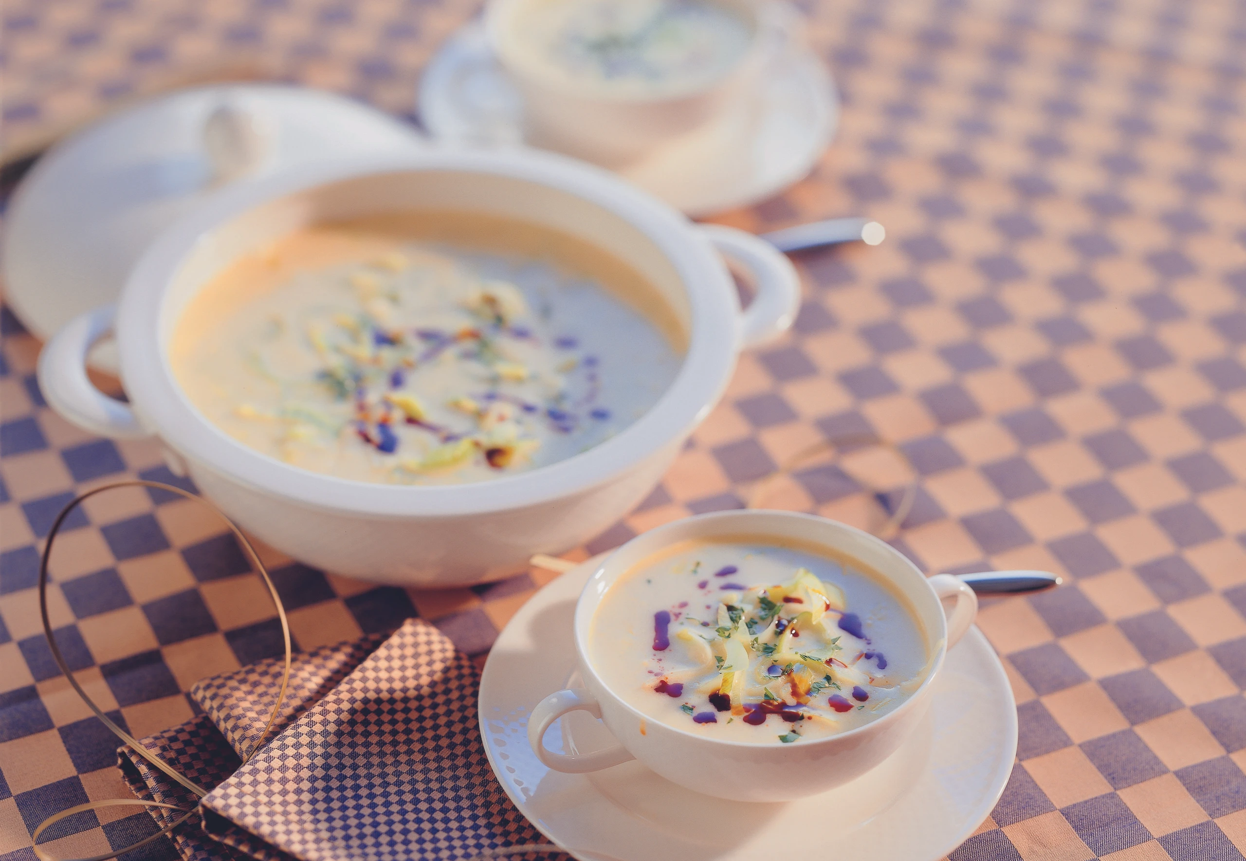 Schlagobers in die Suppe gießen, nochmals aufkochen, mit Salz, Pfeffer und etwas Muskatnuss würzen und mit einem Schneebesen verrühren (falls die Suppe zu dick geworden ist, mit etwas Hühnersuppe verdünnen).