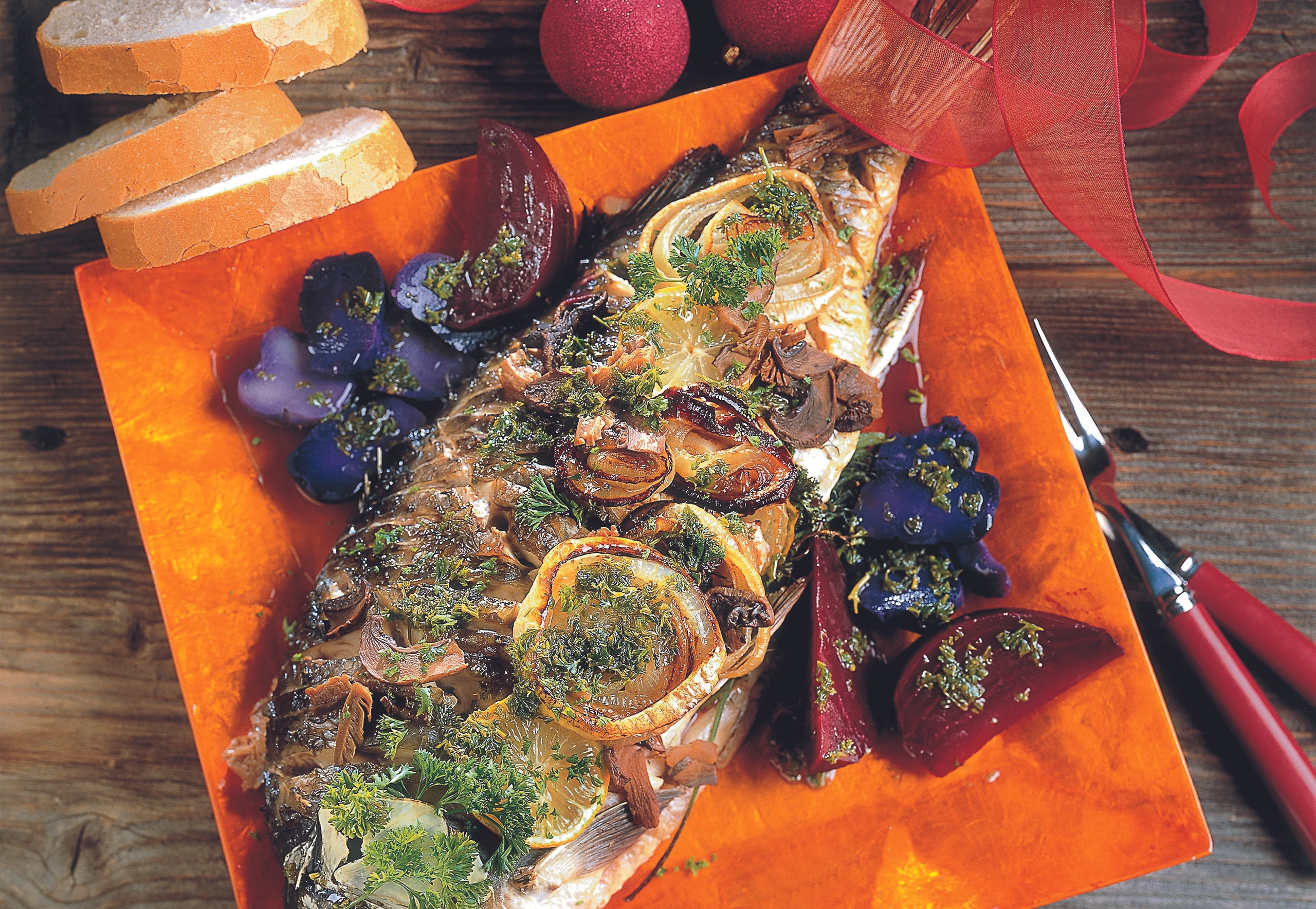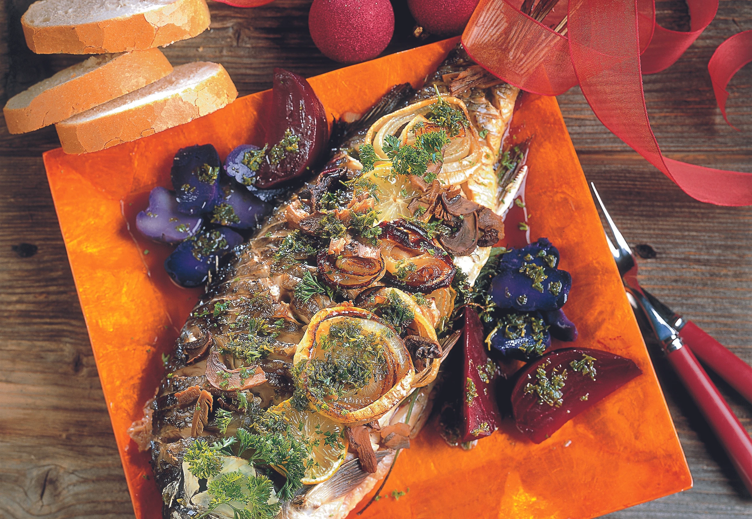 Pilze in 500 ml warmem Wasser einweichen. Den Karpfen „ziselieren“ (wie eine Schweinsstelze – in 0,5 cm Abstand nicht zu tief einschneiden), salzen, pfeffern und mit warmem Schmalz oder Butterschmalz beträufeln.