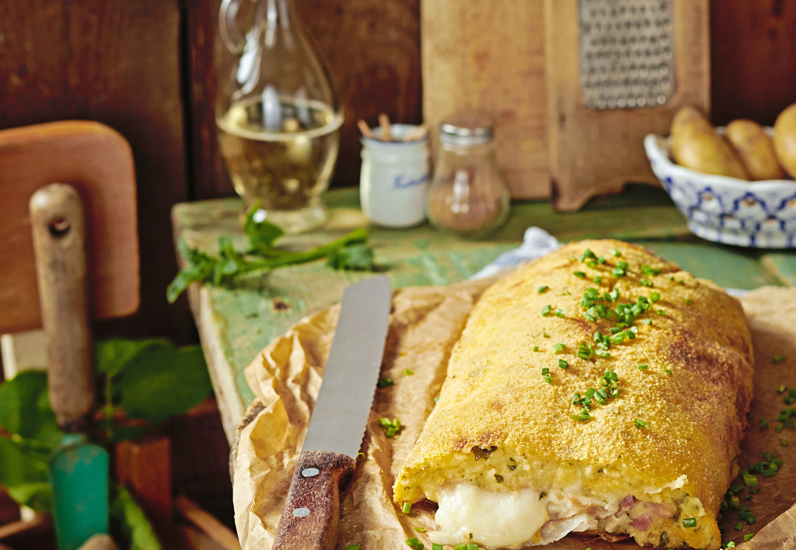 Erdäpfelteig auf einer bemehlten Arbeitsfläche zu einem Rechteck (ca. 20 x 25 cm) flach drücken. Scamorza in Scheiben schneiden und mit dem Prosciutto darauf legen. Teig von unten nach oben möglichst eng einrollen.