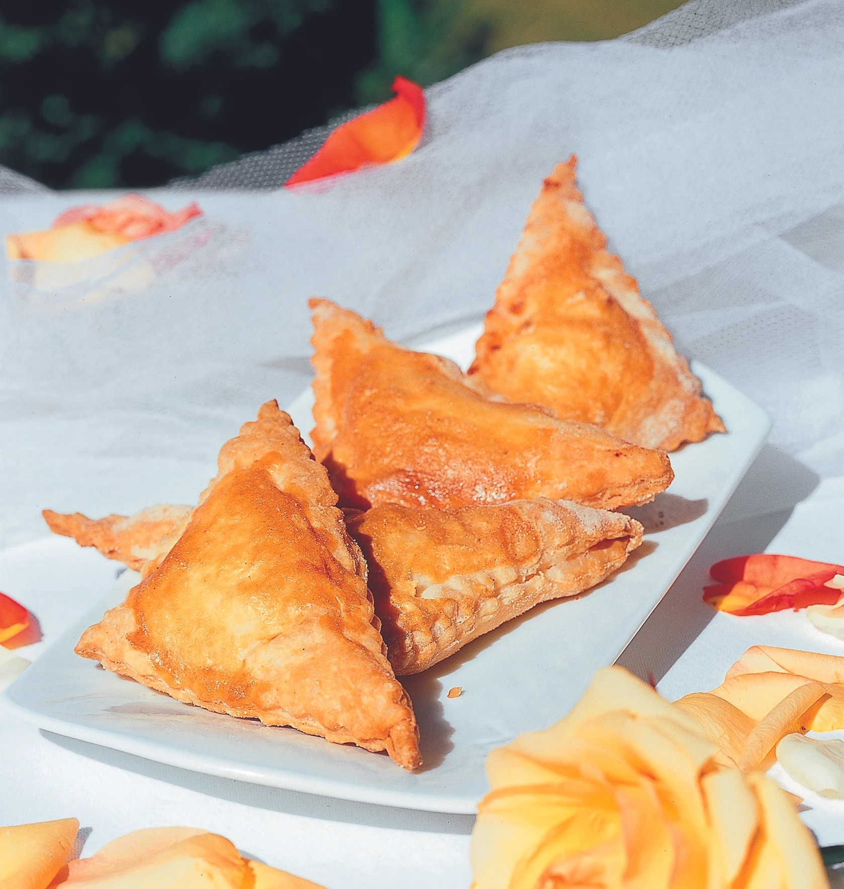 - Teig in 8 Quadrate (10 x 10 cm) schneiden, Ränder dünn mit Dotter bestreichen. Fülle auf den Teigstücken verteilen. Teigstücke diagonal zusammenklappen, die Kanten mit den Zinken einer Gabel gut zusammendrücken.