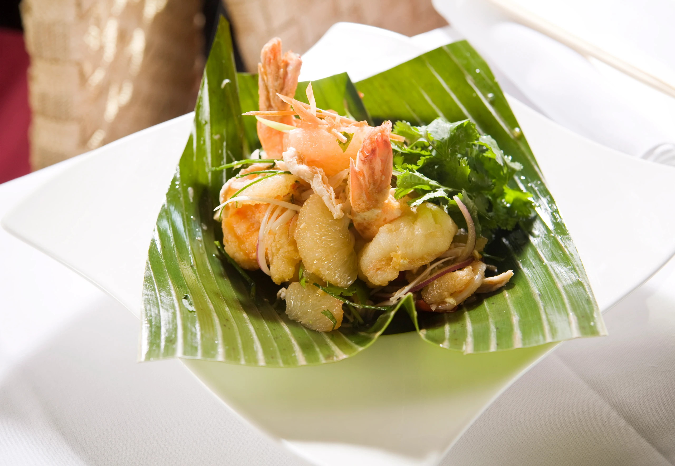 Garnelen entdarmen, der Länge nach so aufschneiden, dass das Schwanzstück die Hälften zusammenhält. Garnelen in Sesamöl kurz knusprig braten und mit dem Salat vermischen. Salat auf einem Stück Bananenblatt anrichten, mit Koriander garnieren.