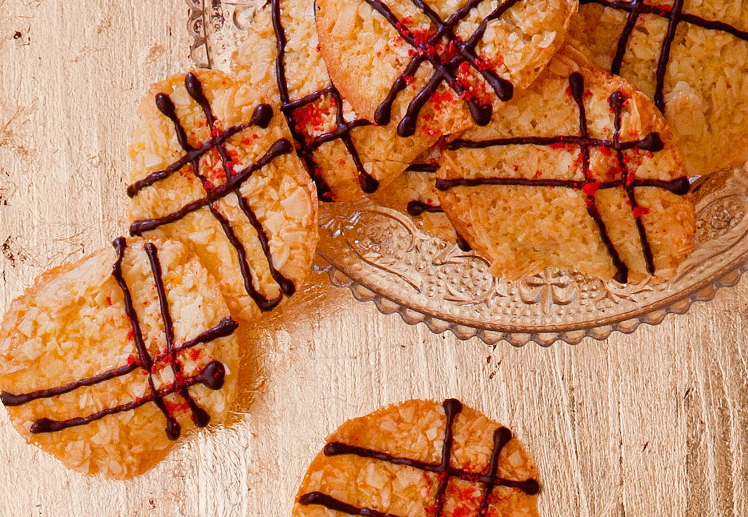 Inzwischen einen Nudelwalker oder eine schlanke Flasche mit Küchenpapier umwickeln. Die Mandelscheiben aus dem Rohr nehmen, sofort mit einer Palette vom Blech lösen, über den Nudelwalker legen und auskühlen lassen.