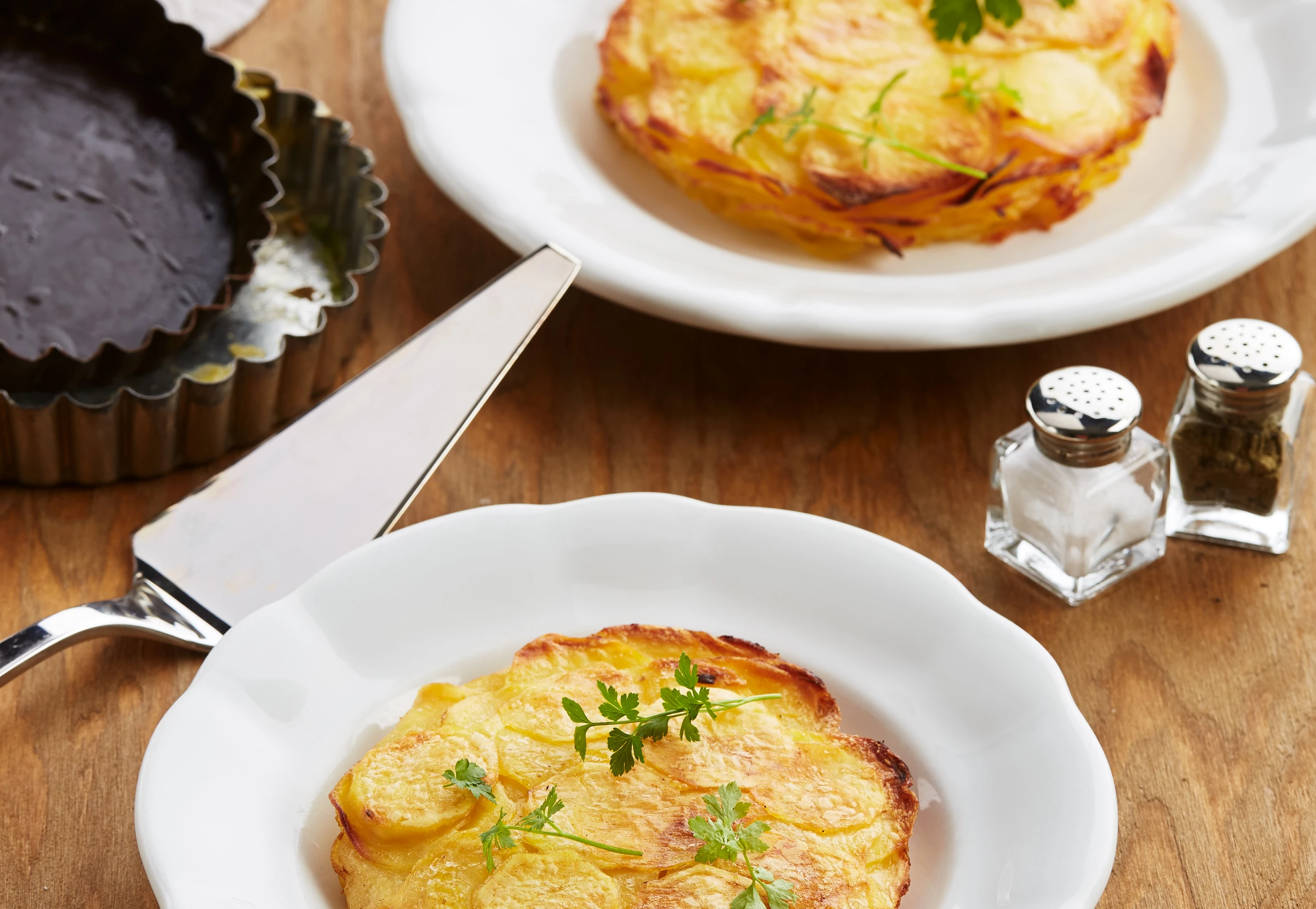 Butter bis zur leichten Braunfärbung erhitzen und umfüllen. Erdäpfel schälen und in möglichst dünne Scheiben schneiden (Brotschneidemaschine, Gemüsehobel). Erdäpfelscheiben mit der Butter vermischen, salzen, pfeffern und in mehreren Lagen dachziegelartig in die Förmchen schichten, jede Lage ein wenig in die Förmchen drücken.