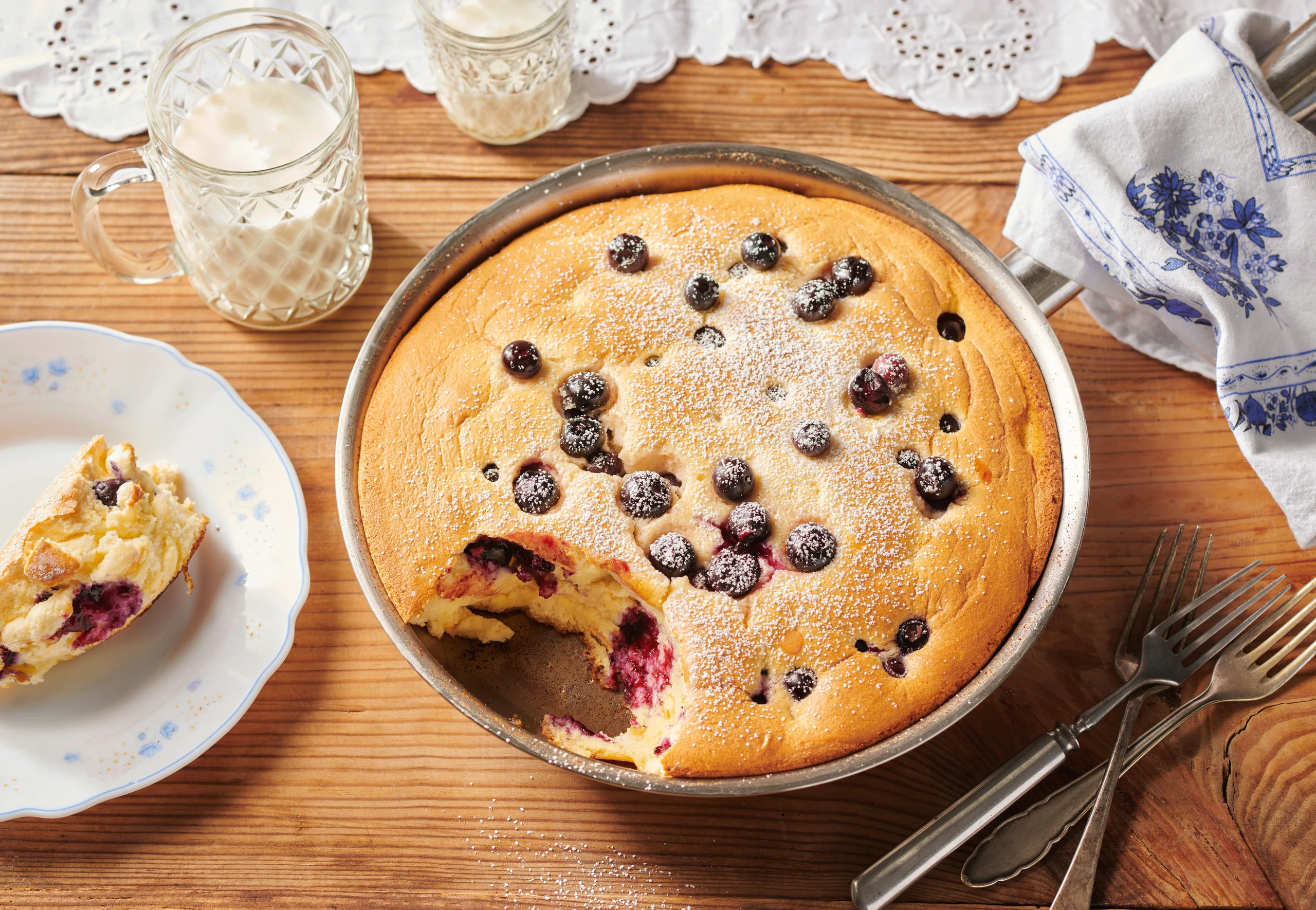 Die Beeren setzen sich ein bisschen ab, da der Teig sehr aufgeht. Sie können 1 kleine Hand voll Heidelbeeren beiseitestellen und erst nach ca. 15 Minuten Backzeit auf dem Flenggen verteilen.Aus dem Heft:
