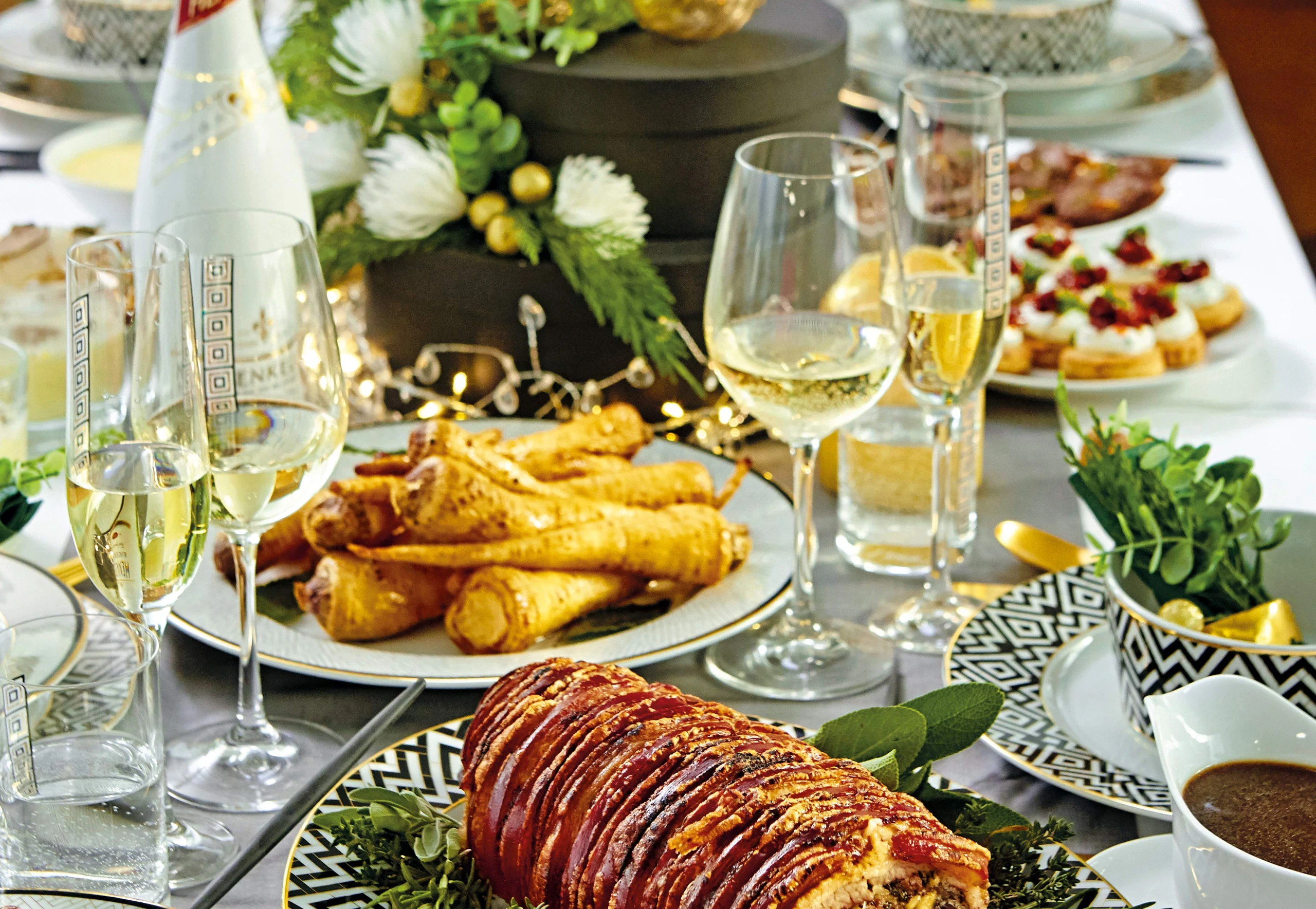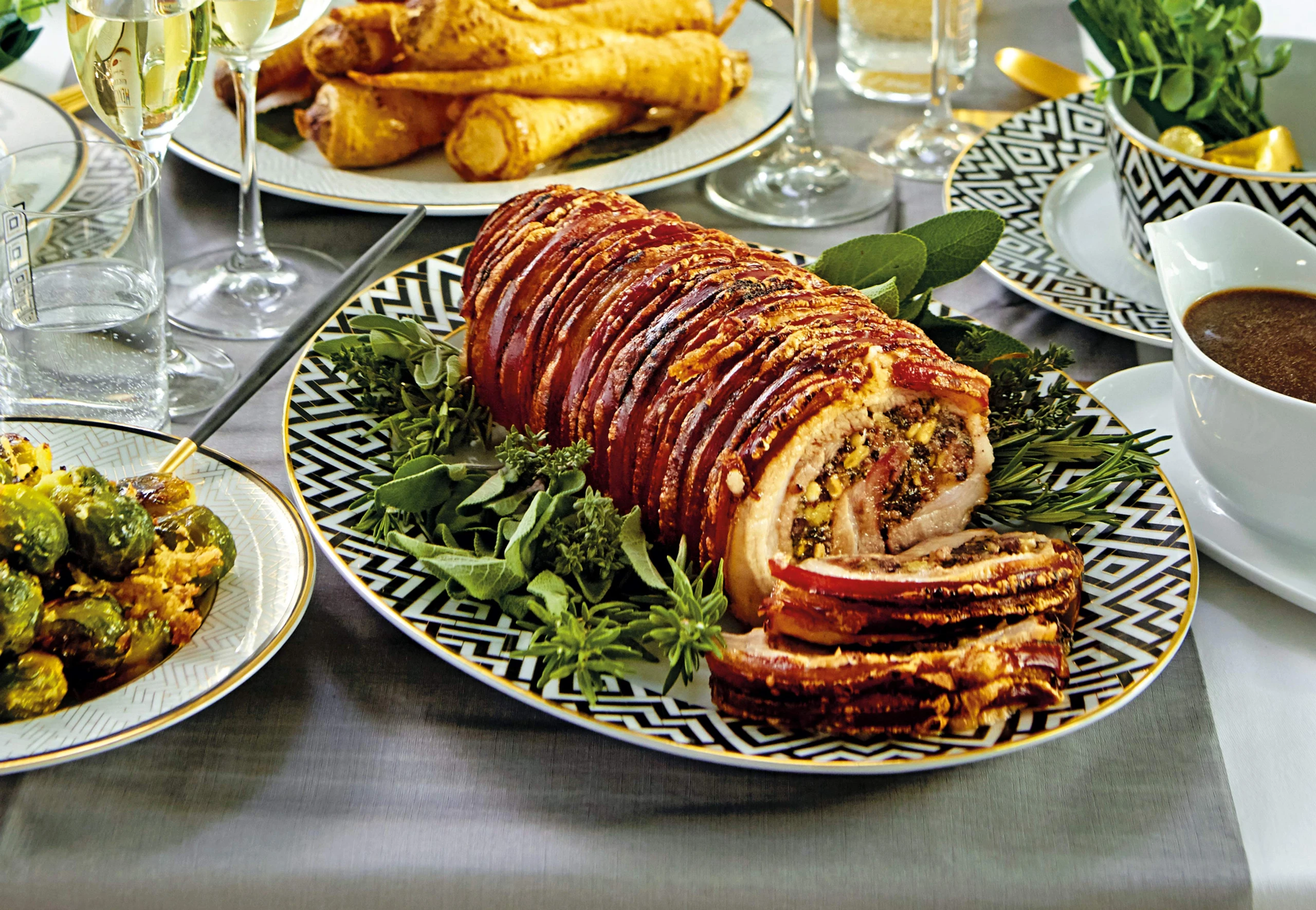 Schweinebauch mit der Schwarte nach unten auf die Arbeitsfläche legen. Mit Sherry beträufeln, mit Salz und Pfeffer würzen. Fülle mittig darauf verteilen und andrücken. Schweinebauch möglichst eng einrollen und mit Küchengarn festbinden.