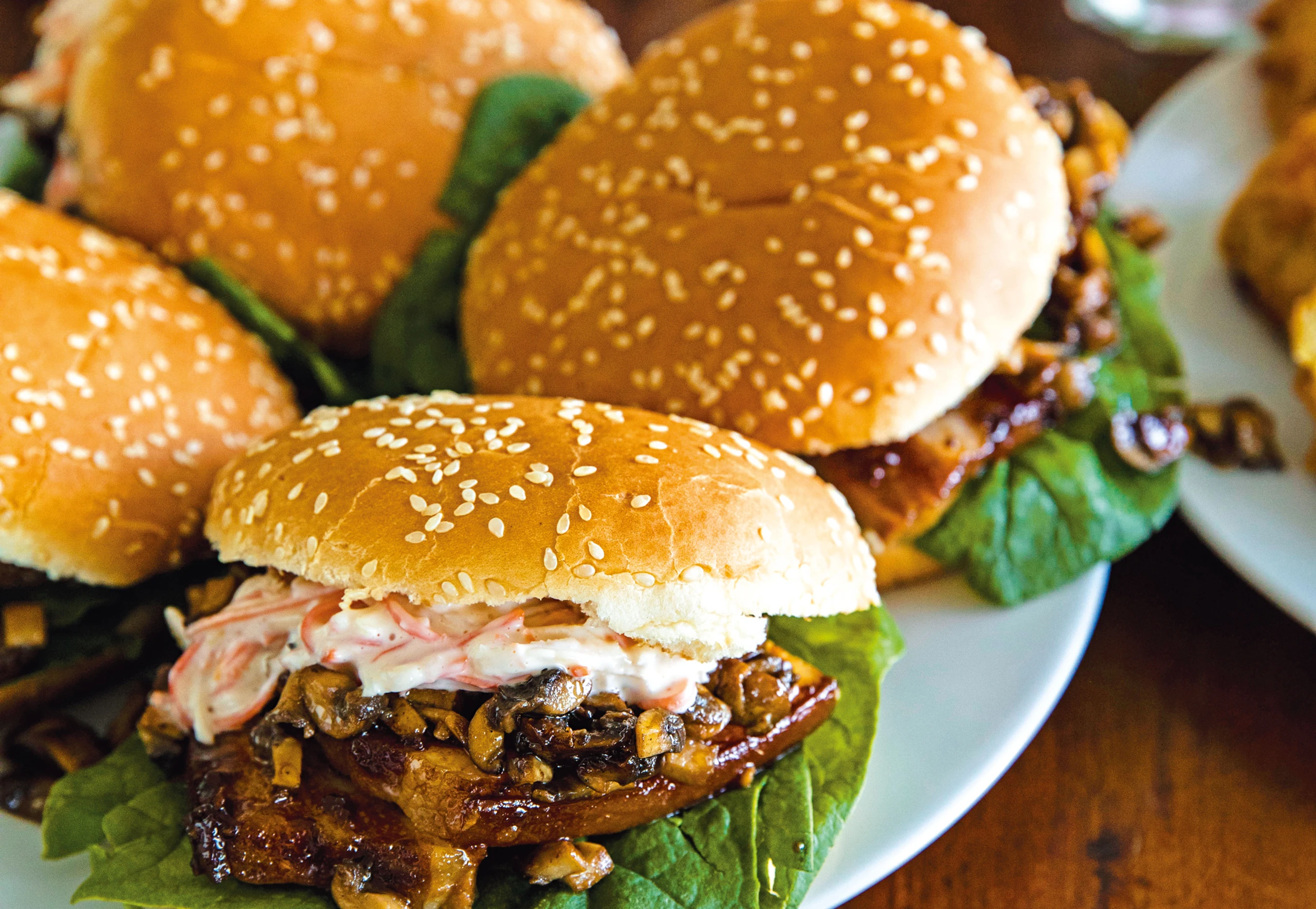Buns mit Spinatblättern, Schweinebauch, Pilzen und Coleslaw füllen.