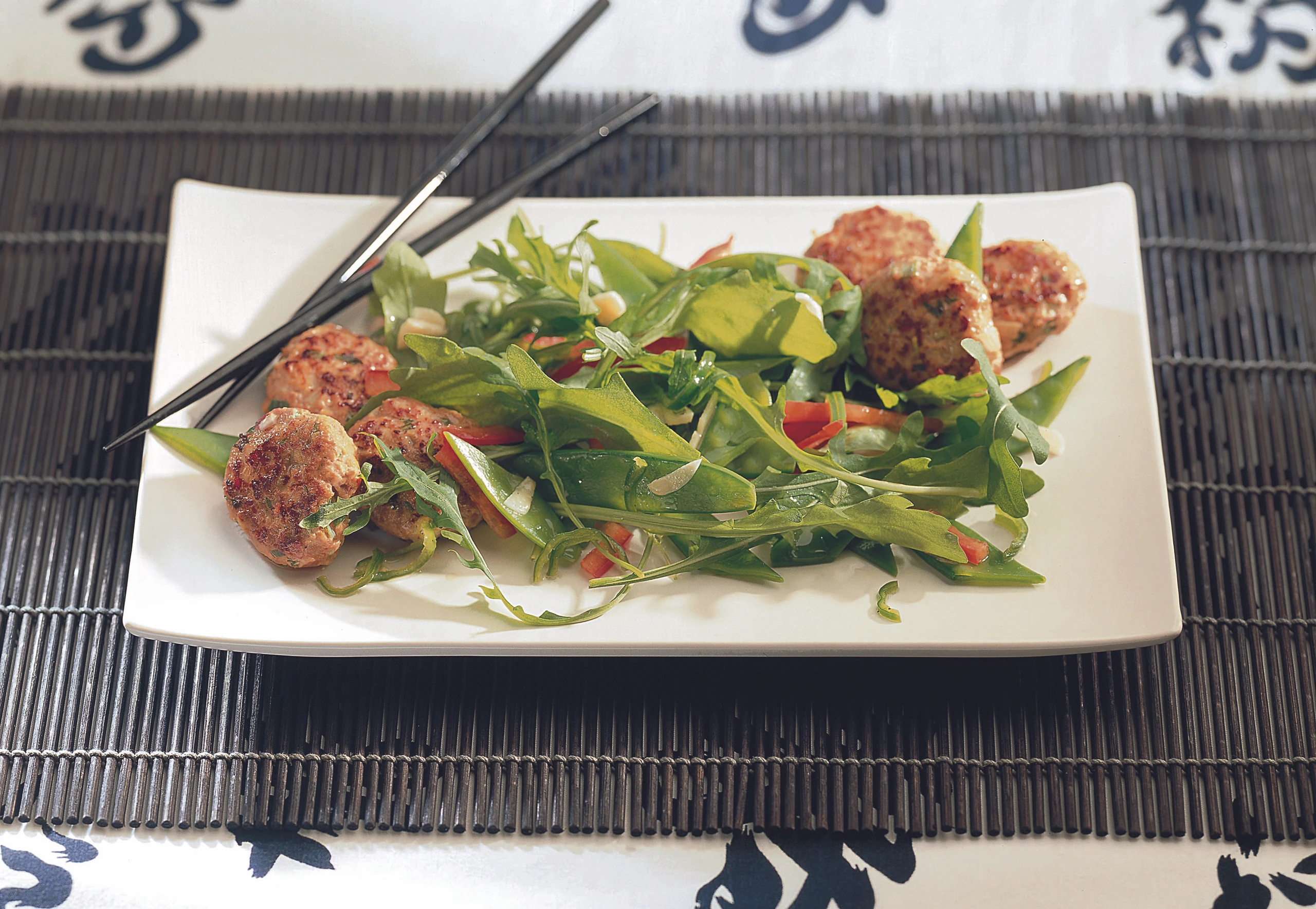 Rucola, Erbsenschoten, Paprika und Fleischlaibchen anrichten und mit Marinade beträufelt servieren.