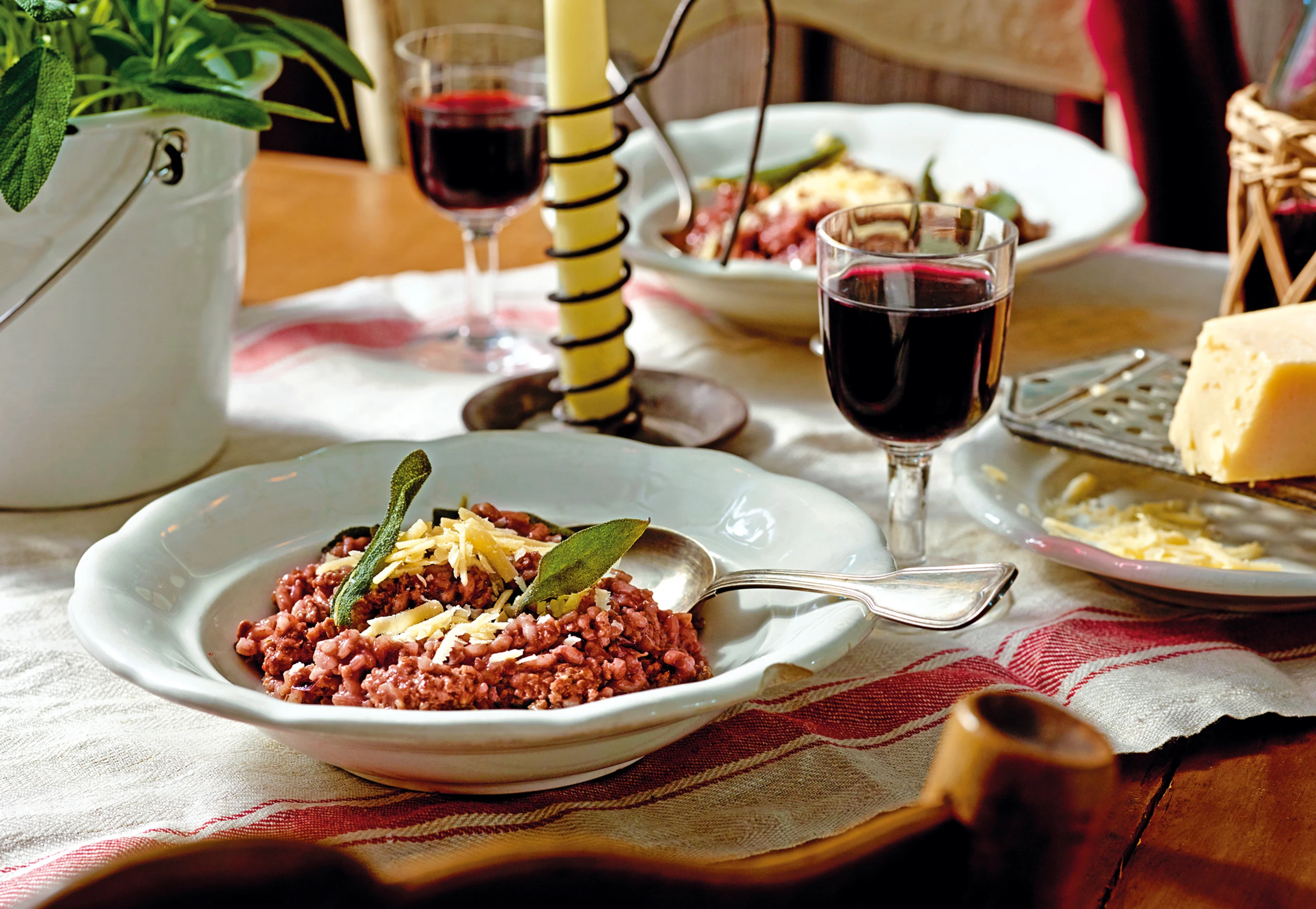 Risotto anrichten und mit grob geraspeltem Parmesan und Salbeiblättern bestreut servieren.