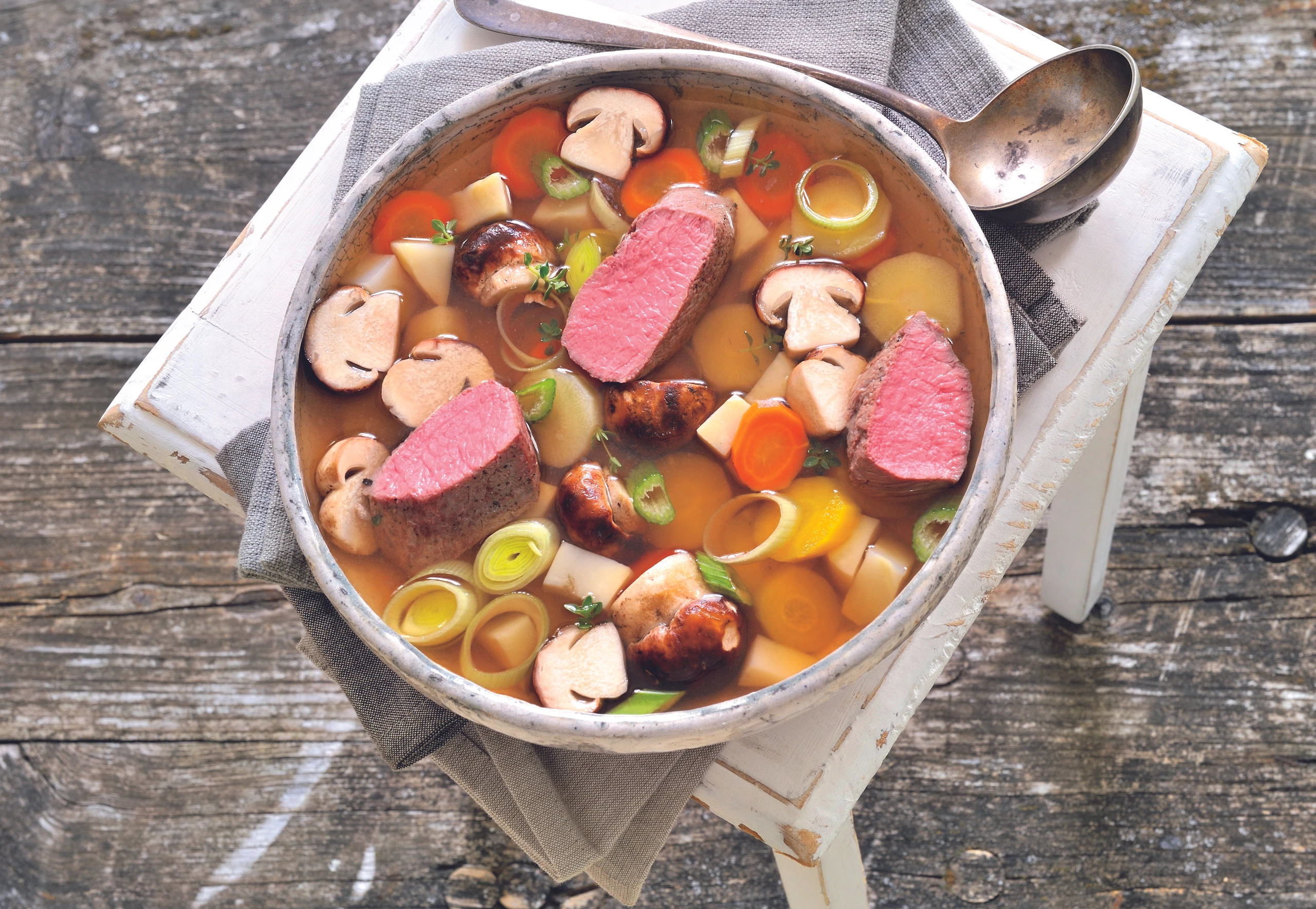 - Thymianblätter von den Stielen zupfen und in den Eintopf rühren. Lammfleisch aufschneiden und mit dem Pot-au-feu anrichten.