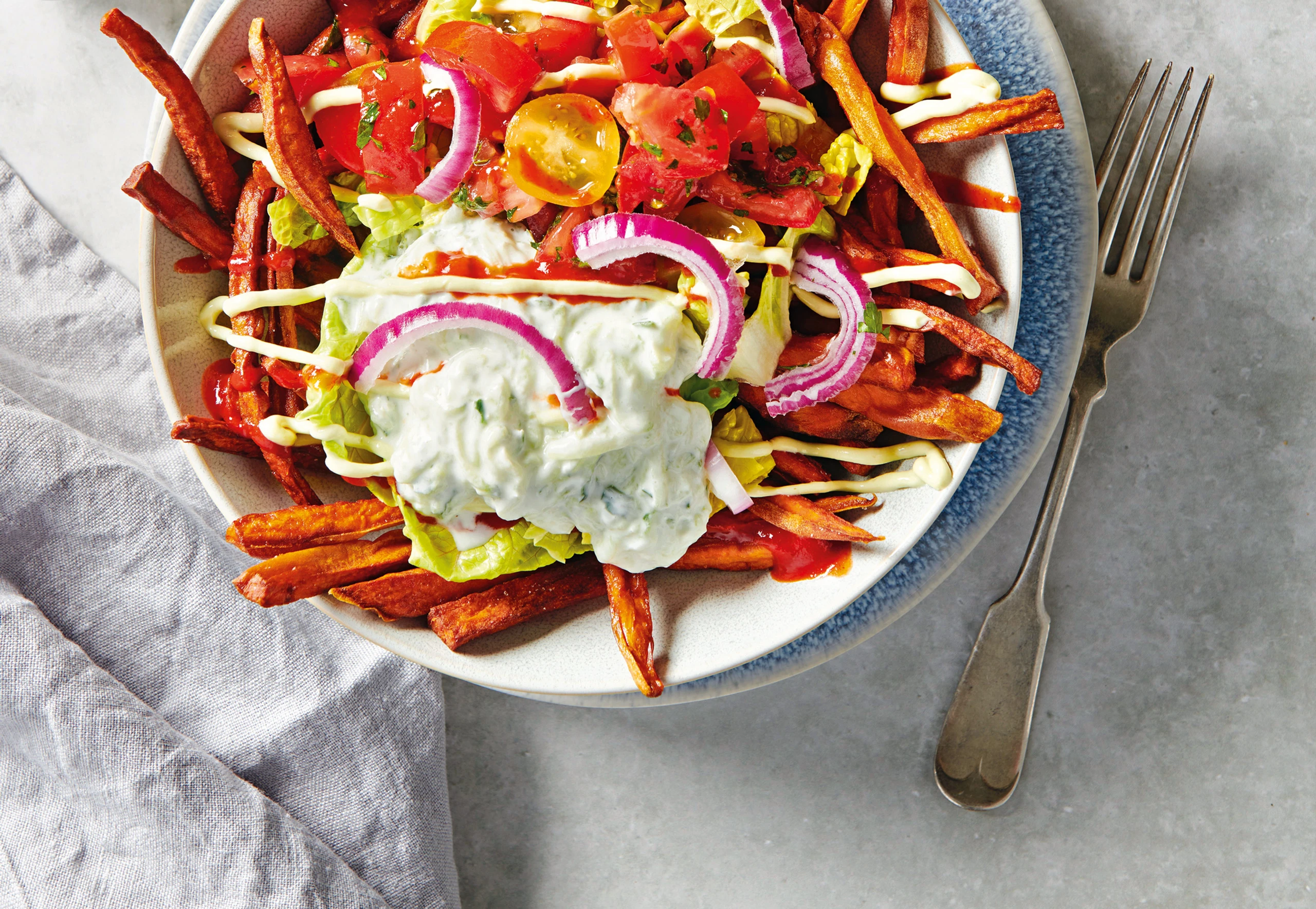 Zwiebel schälen und in Ringe schneiden. Salat in Streifen schneiden. Pommes in 4 tiefen Tellern oder Schüsseln verteilen. Salat, Zwiebel, Tsatsiki, Salsa, Mayonnaise und Sriracha darauf verteilen.