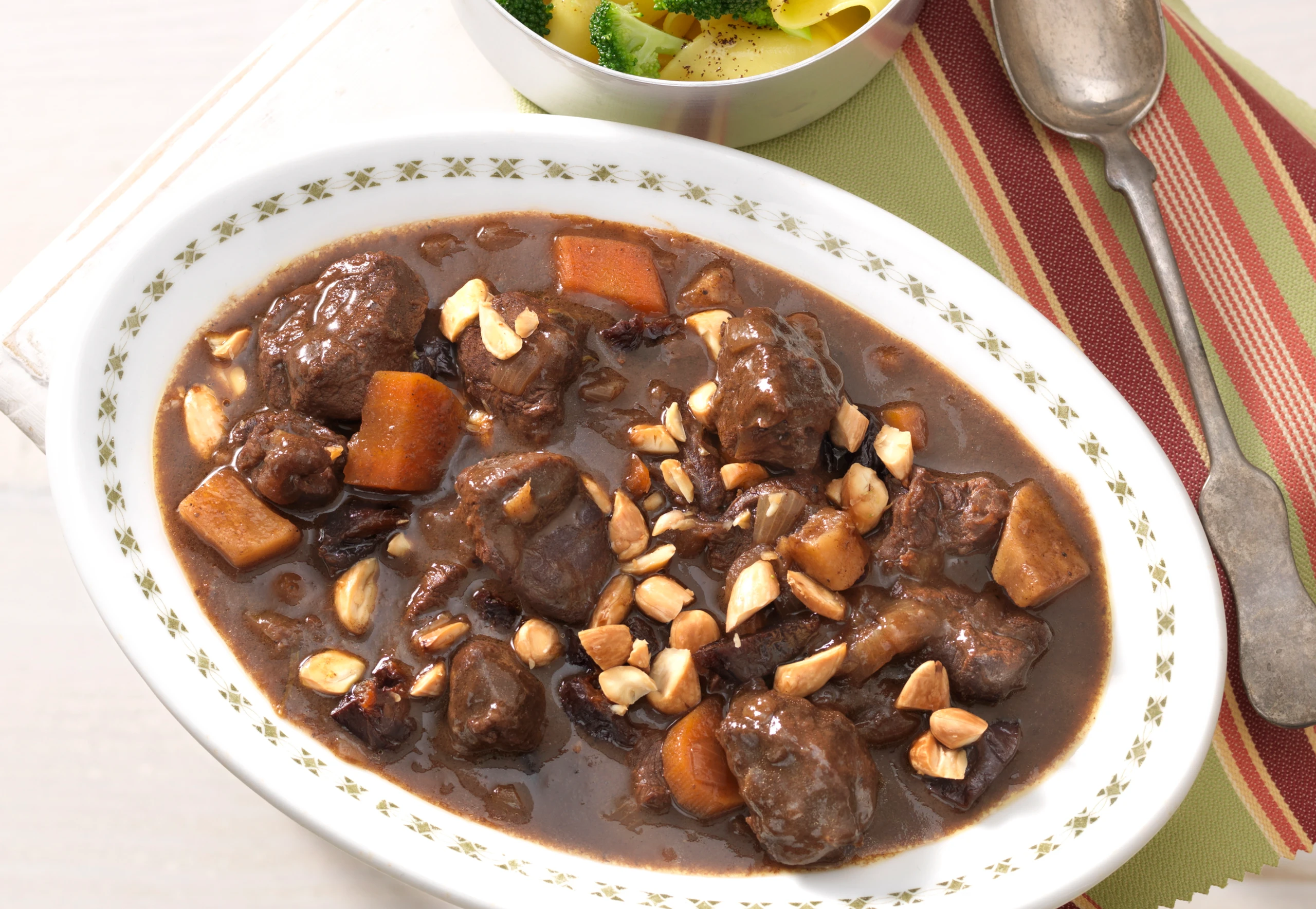 Suppe zugießen, Fleisch einlegen und auf-kochen. Erdapfel schälen, fein raspeln und in das Ragout rühren. Bei mittlerer Hitze weich dünsten (ca. 40 Minuten); dabei öfters umrühren.