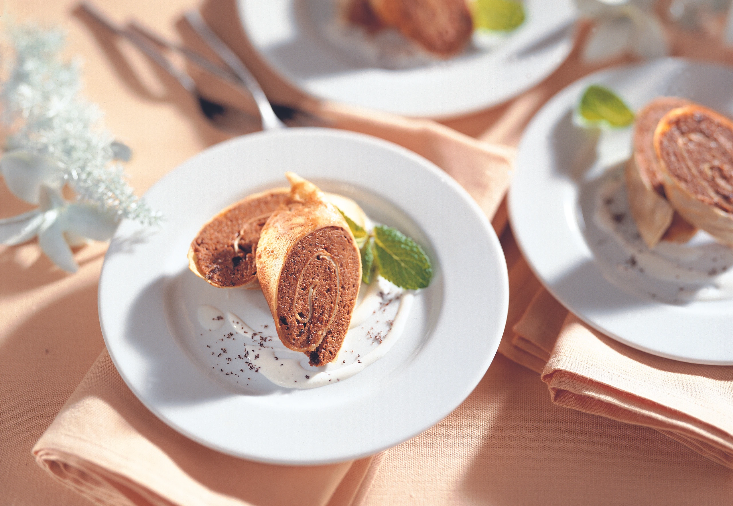 Aus dem Teig in Butterschmalz 2 Palatschinken (Ø 26 cm) backen und auskühlen lassen. Palatschinken mit der Fülle bestreichen, eng einrollen, mit Frischhaltefolie zudecken und für 2 Stunden kalt stellen.