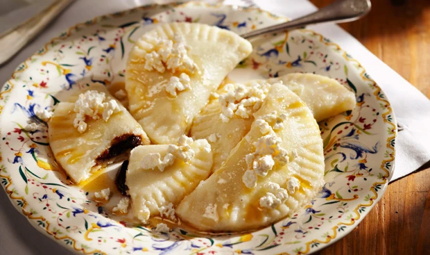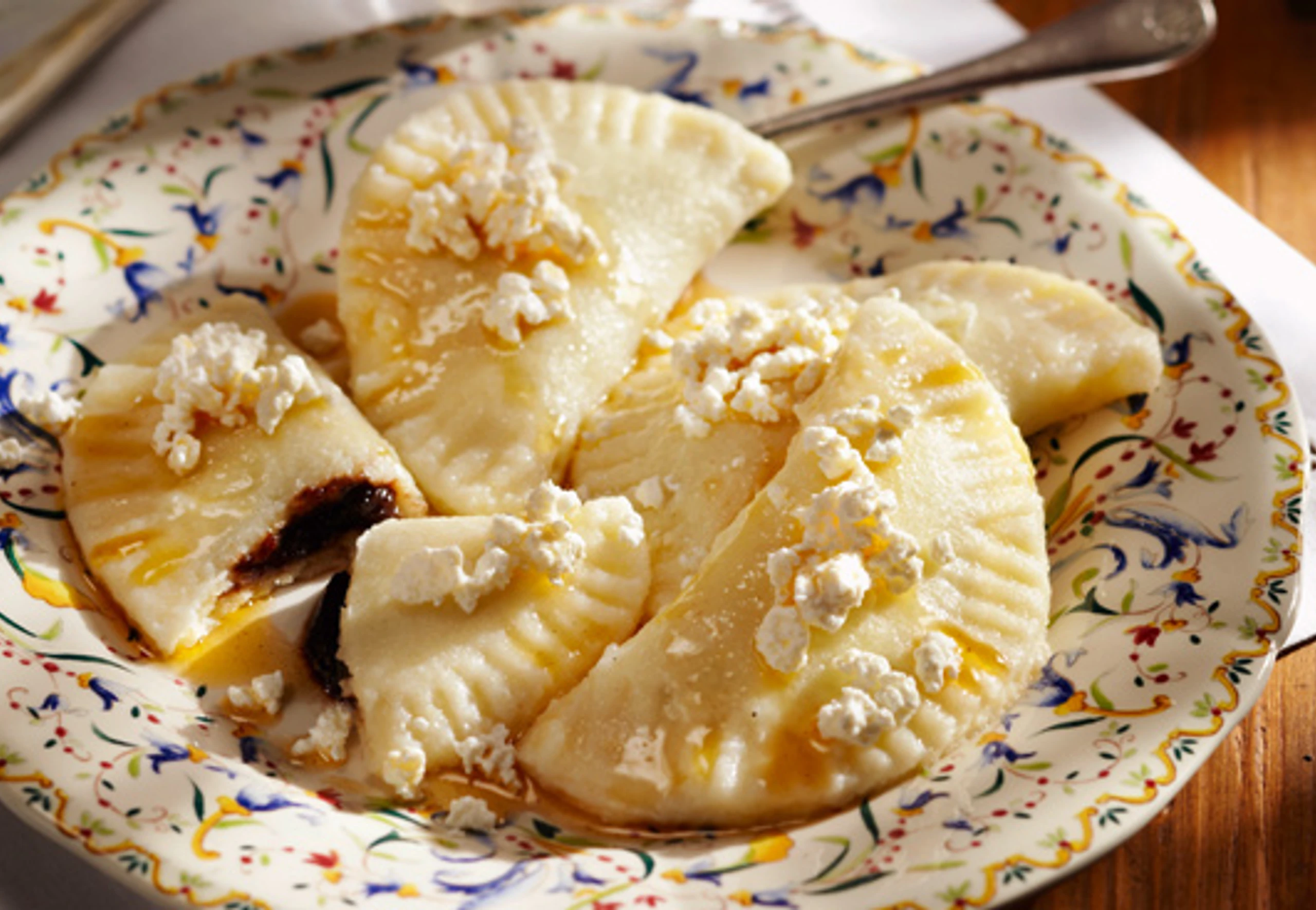 - Erdäpfel, Topfen, Grieß und Ei zu einem festen Teig kneten; falls er zu weich ist, etwas Mehl untermischen. Teig auf einer bemehlten Arbeitsfläche ca. 4 mm dick ausrollen, 16 Scheiben (Ø ca. 8 cm) ausstechen. Powidl in die Mitte setzen, Ränder mit Ei bestreichen, Scheiben zusammenklappen, Ränder mit einer Gabel zusammendrücken.