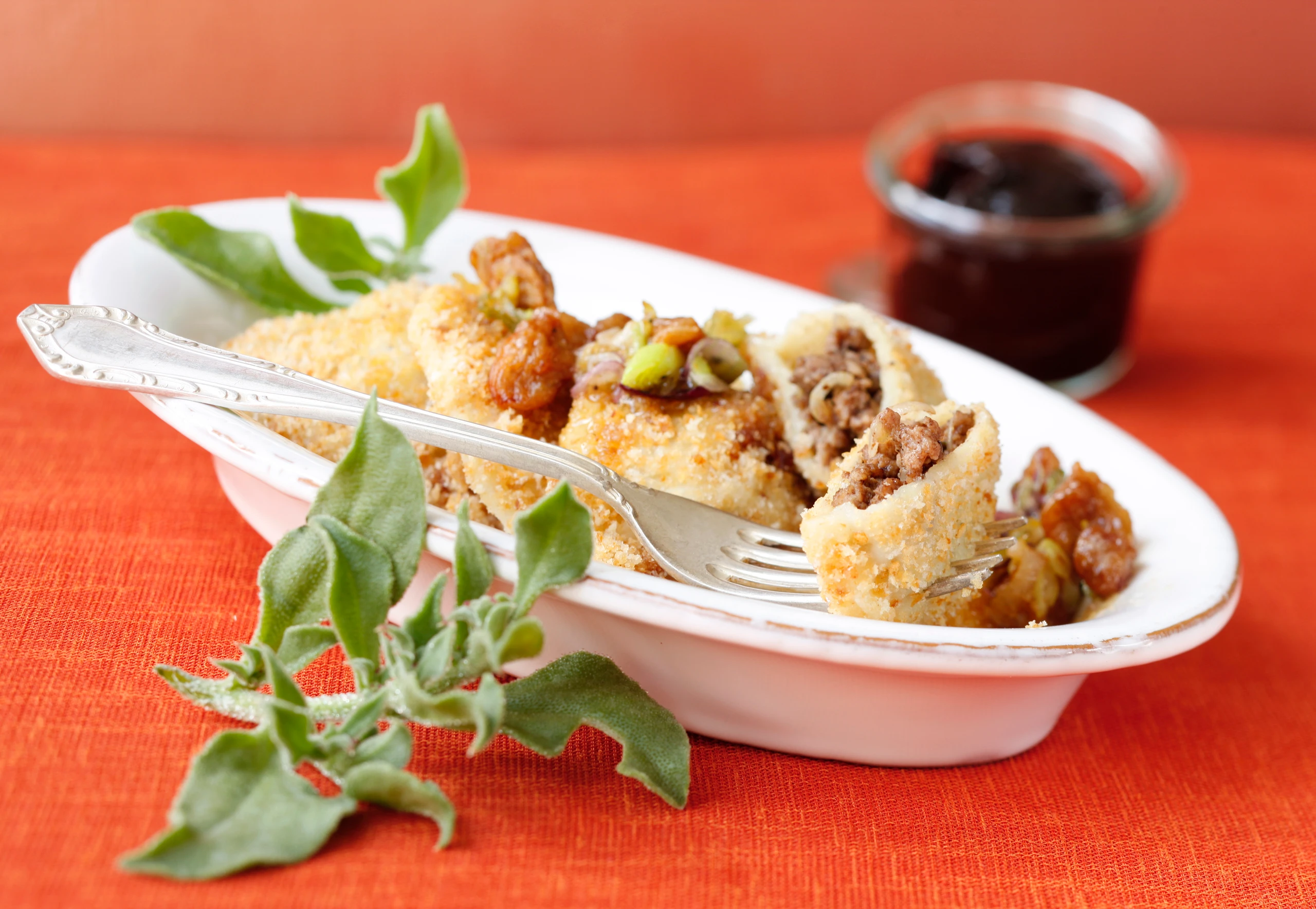 Für die Fülle Zwiebel schälen, klein schneiden und in 2 EL Öl anschwitzen. Faschiertes untermischen, mitbraten, mit Salz, Pfeffer und Salbei würzen. Powidl unterrühren, Masse vom Herd nehmen und auskühlen lassen.