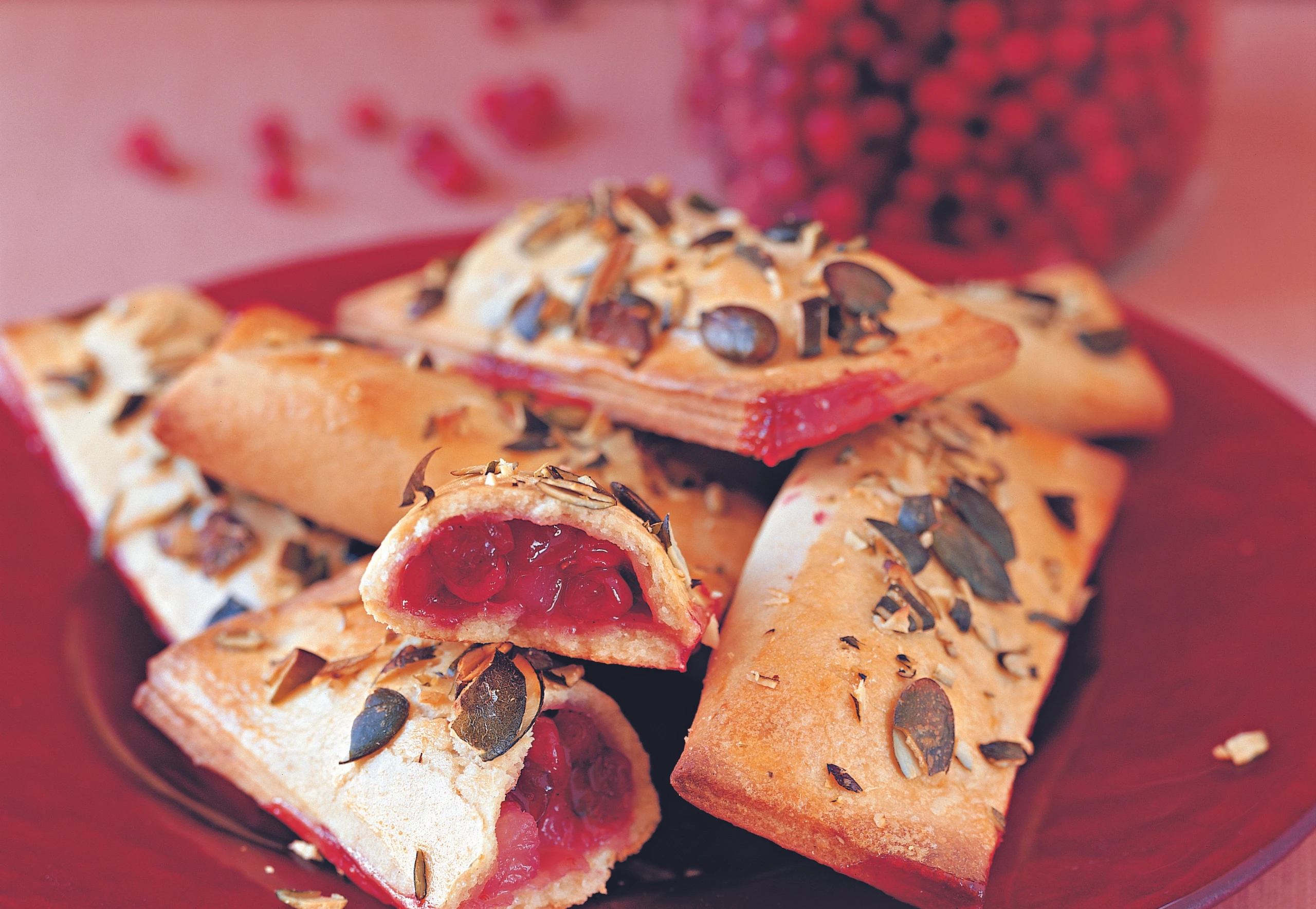 Teig auf einer bemehlten Arbeitsfläche 3 mm dick ausrollen, Rechtecke ausschneiden (13 x 11cm), Ränder mit Ei bestreichen. Teigstücke mit je 1 1/2 EL Marmelade belegen, zusammenklappen, auf das Blech legen, mit Ei bestreichen und mit Kürbiskernen bestreuen. Im Rohr (mittlere Schiene / Gitterrost) ca. 12 Minuten backen.