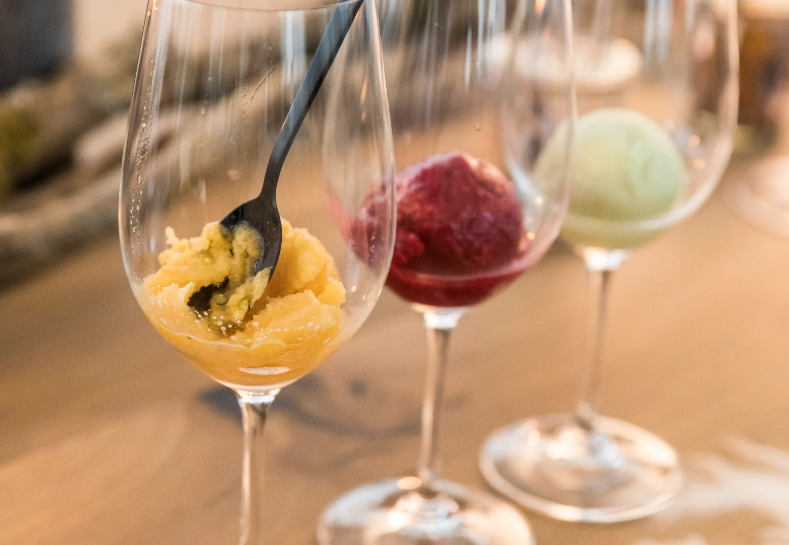 Sorbet in der Eismaschine cremig rühren und anrichten.