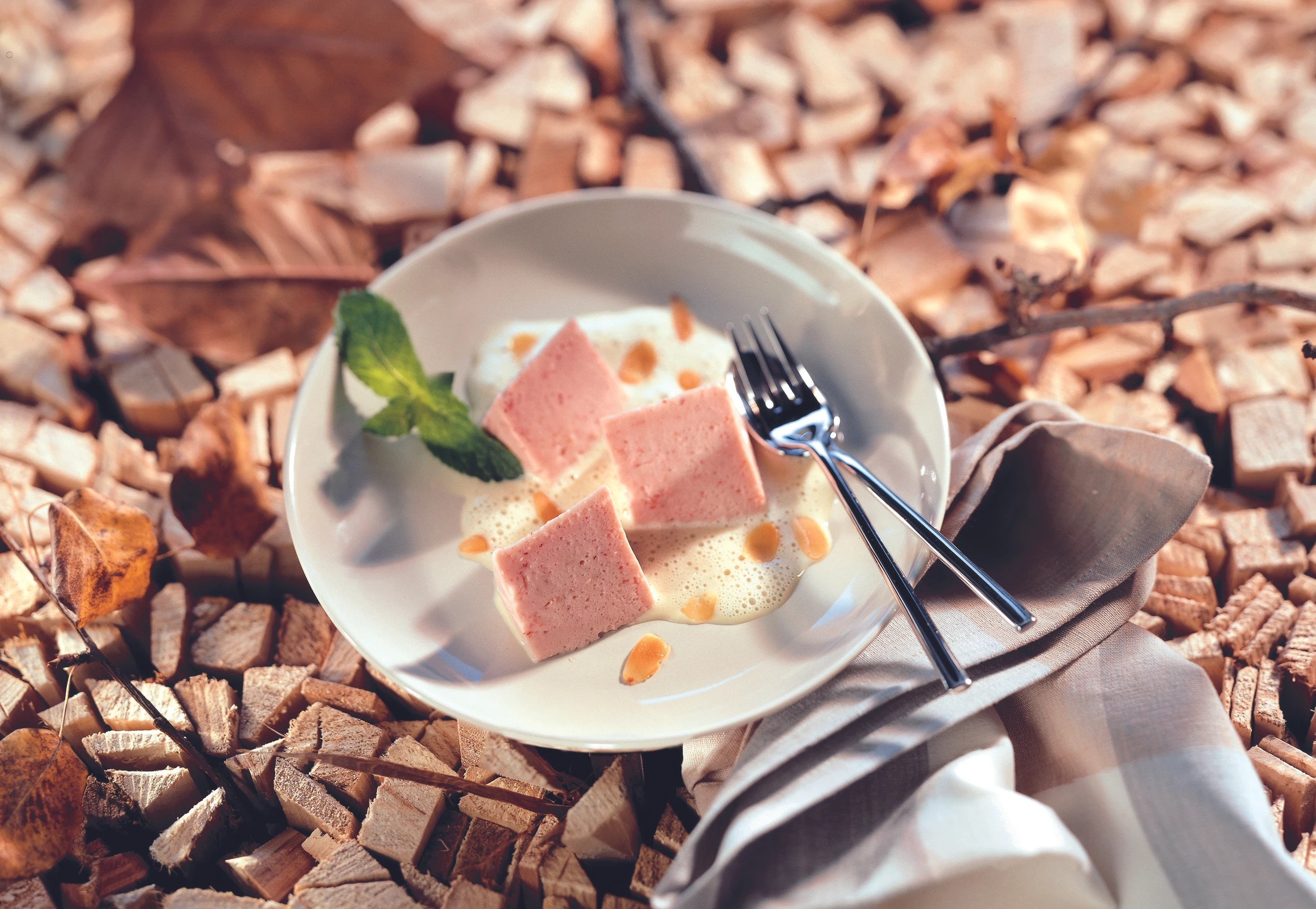 Terrine aus der Form stürzen, in Scheiben oder Stücke schneiden und mit der Mandelsauce anrichten, mit Minzeblättern und Mandelblättchen garnieren.
