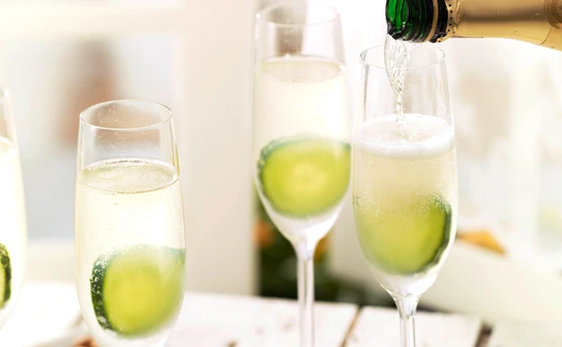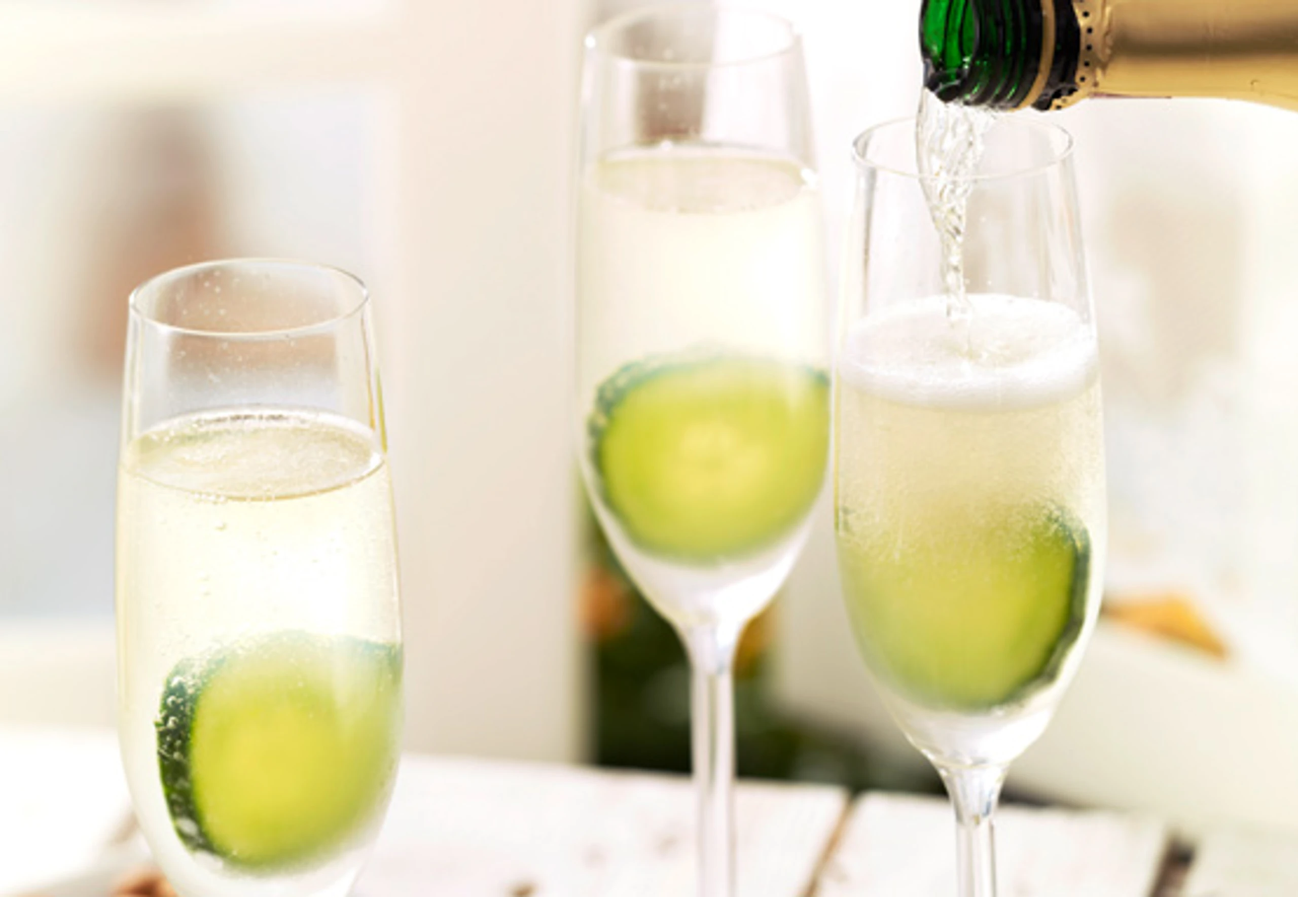 - Wodka, Mandelsirup, Zitronensaft sowie 1 Hand voll Eiswürfel in einen Shaker geben, ca. 20 Sekunden kräftig schütteln. Drink durch ein Sieb in ein Sektglas gießen. Glas mit Sekt oder Prosecco auffüllen, mit einer Gurkenscheibe garnieren.