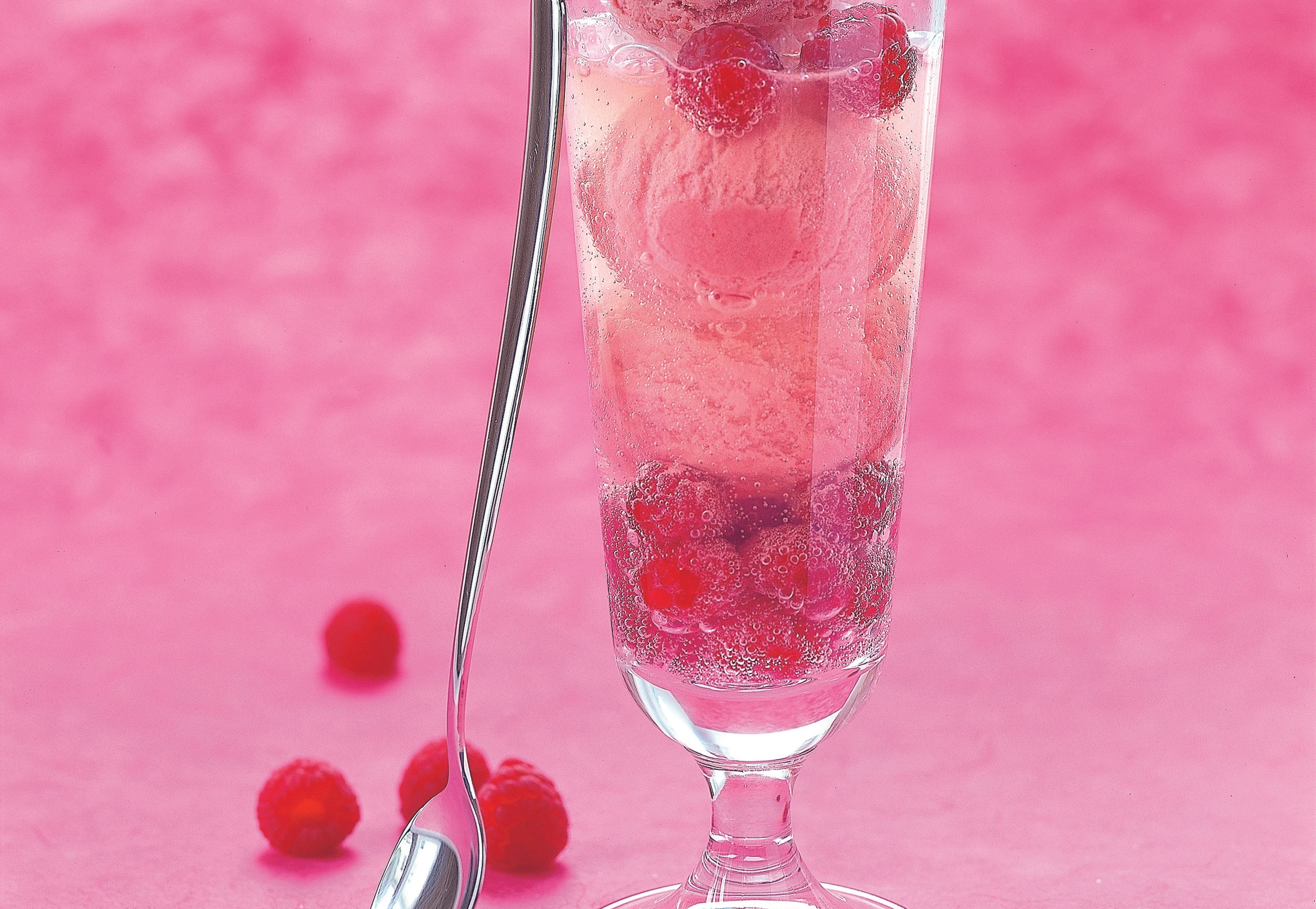Prosecco und Läuterzucker mischen. Prosecco, dann Himbeeren in den Gläsern verteilen, mit Himbeereis auffüllen.
