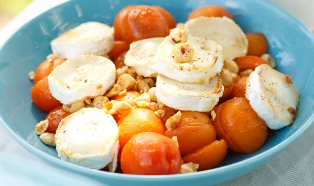 Rohr auf Grillstellung vorheizen. Haselnüsse grob hacken. Ziegenkäse in 1 cm dicke Scheiben schneiden, im Rohr (obere Schiene) kurz übergrillen. Marillen mit Haselnüssen, Salz und Pfeffer bestreuen, mit dem Ziegenkäse anrichten.
